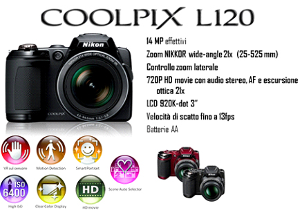 Di particolare interesse la bridge della serie L120, proposta ad un prezzo di 270,00€, presenta display da 3 pollici e 920k punti, ottica 21x (25-525mm equivalenti) e sensore da 14 Mpixel. Il modello in questione è in grado di registrare filmati a 720p con audio stereo.