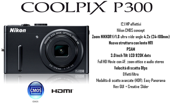 Passando alla serie P, il modello P300, disponibile ad un prezzo di 330€, dispone del medesimo sensore CMOS retroilluminato del modello S9100, ma dispone di un ottica con lente HRI ad elevato indice di rifrazione (che consente di ridurre gli effetti di distorsione dell'immagine); l'escursione è limitata a 4,2x, ma con apertura massima di f/1.8. Il modello dispone della funzionalità di scatto HDR direttamente onboard e di una serie di controlli manuali. Completano il quadro il supporto alla registrazione di filmati in Full HD, display da 3" e 920k punti.