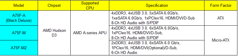 Le ECS Black Deluxe A75F-A, A75F-M e A75F-M2 supportano tutte l'ultima serie denominata A delle APU di AMD con chipset Hudson D3 e con socket FM-1. Con i bus nativi USB 3.0 e SATA 6.0 Gb/s potenziati dal chipset Hudson D3, la serie ECS A75 rappresenta ufficialmente l'inizio della nuova era del trasferimento dati ad alta velocità, rendendo così palese la necessità di equipaggiare di base ogni computer con connessioni USB 3.0 e SATA 6.0 Gb/s.