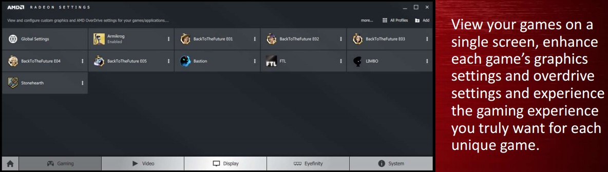 Come riporta una diapositiva, il nome sarà composto da "Radeon Software", seguita dall'edizione e dalla versione. Crimson non sarà quindi il nome definitivo, ma cambierà con gli aggiornamenti. Tra le varie impostazioni è presente un'applicazione che ha più o meno le stesse funzioni di NVIDIA Experience.