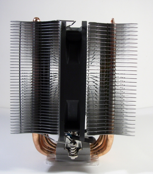 Il dissipatore é dotato di  4 heatpipes di rame da 8mm e, grazie alle sue 70 alette e ad una superficie di 7500cm2, si riescono ad ottenere temperature decisamente basse. Anche la base è costruita in rame ma non presenta una lappatura a specchio.
