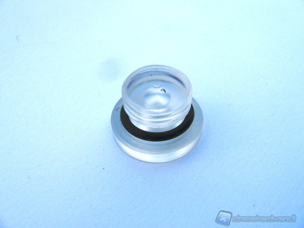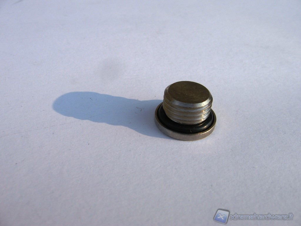 In foto potete osservare uno dei 3 tappi filettati che accompagnano la vaschetta; sono dotati di o-ring per cui è possibile spostarli a piacimento in qualsiasi foro. Gli o-ring permettono, una volta avvitati i tappi, di chiudere il circuito con tenuta stagna.