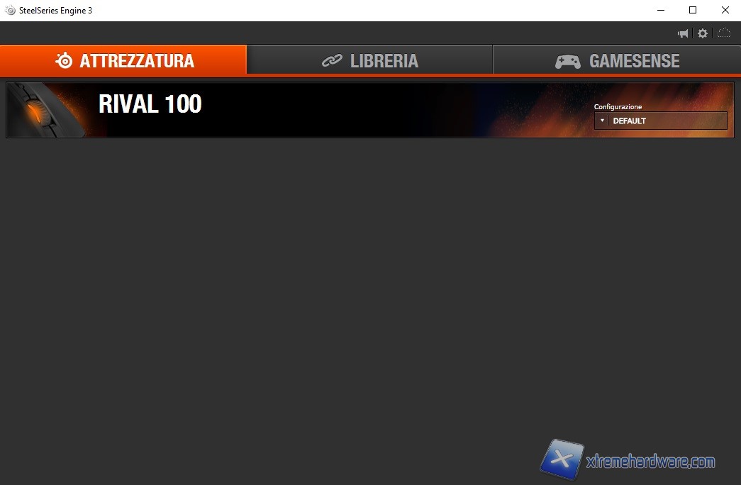 Il software SteelSeries Engine 3 al solito si caratterizza per la presenza di tre Menù principali che sono “Attrezzatura” dove verranno mostrate le periferiche compatibili, ‘’Libreria’’ dove potremo creare e modificare differenti profili collegati alle applicazioni dei nostri giochi ed infine ‘’GameSense’’, un nuovo Menù dal quale potremo gestire la retroilluminazione anche del Rival 100 con diversi effetti visibili negli screen a seguire, ed in diversi giochi.