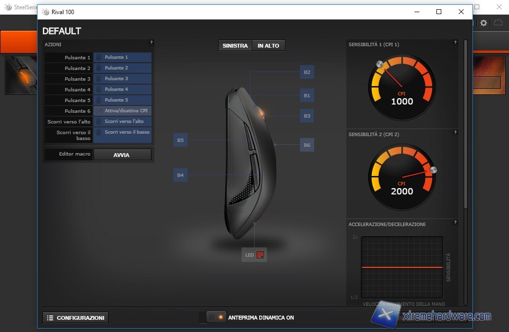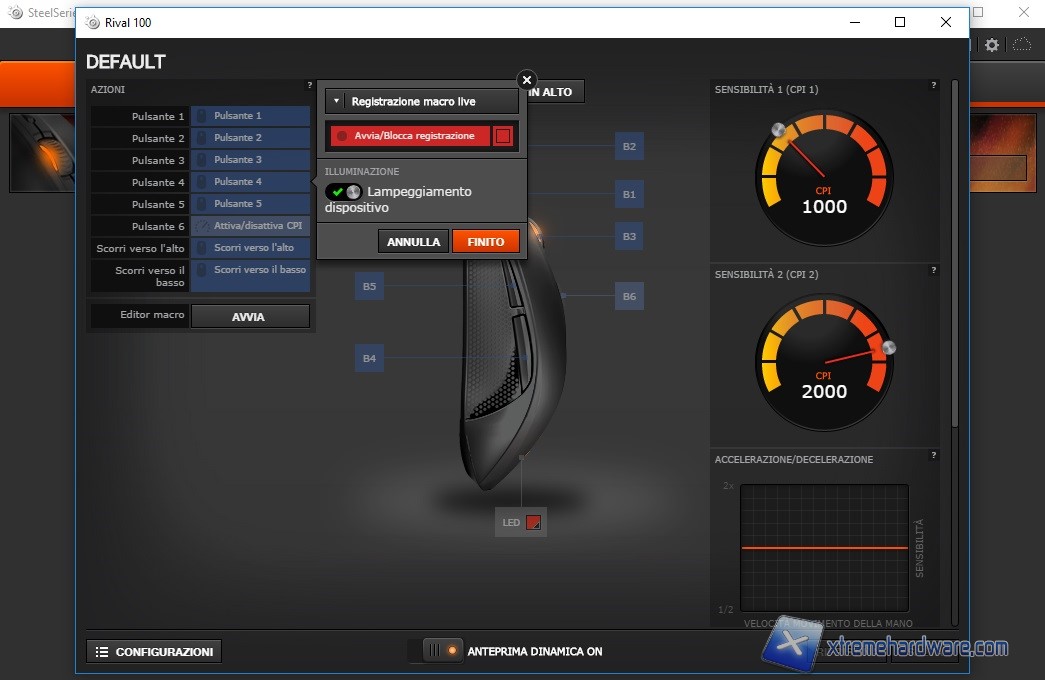 Se non volessimo settare il Rival 100 con la funzione GameSense, ci basterà aprire la schermata del mouse dove troveremo al solito un’immagine 3D del mouse con le diverse funzioni assegnabili ai tasti presenti sullo stesso tra cui anche la registrazione di Macro. Troviamo in totale sei tasti assegnabili più la possibilità di variare il colore del logo SteelSeries sul dorso del mouse anche con diversi effetti visivi come Costante, Respiro, ColorShift. A lato potremo inoltre cambiare la sensibilità del mouse dunque i DPI creando ed agendo su due valori. Potremo ad esempio creare due step uno a 1000DPI ed uno a 2000DPI e con il tasto sotto lo Scroll cambiare Profilo/Step DPI On-The-Fly. A differenza di altri mouse il Rival 100 non permetterà dunque di avere più Step DPI ma solo due. A nostro avviso più che sufficienti in gioco ed eventualmente preconfigurabili prima di lanciare un altro gioco.