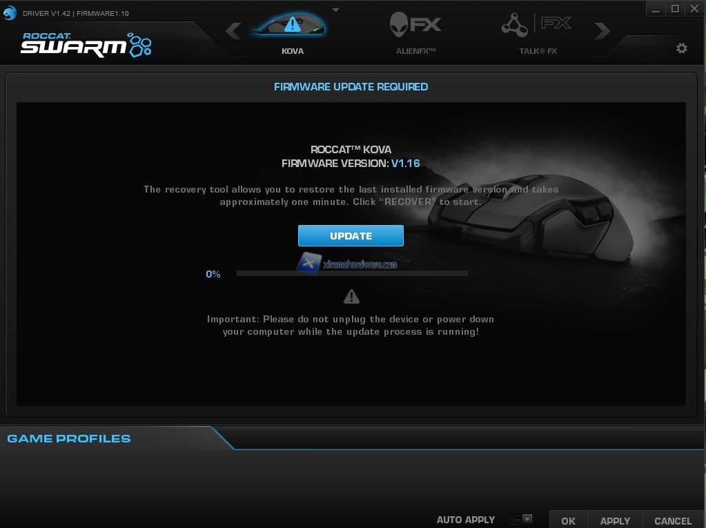 Una volta prelevato ilsoftware di gestione ROCCAT Swarm dal sito del produttore ed installato potremo subito avviarlo per passare all’analisi e ad un eventuale personalizzazione del mouse. Avviato verremo subito avvisati di diversi aggiornamenti tra cui anche quello relativo al firmware del mouse KOVA 2016.