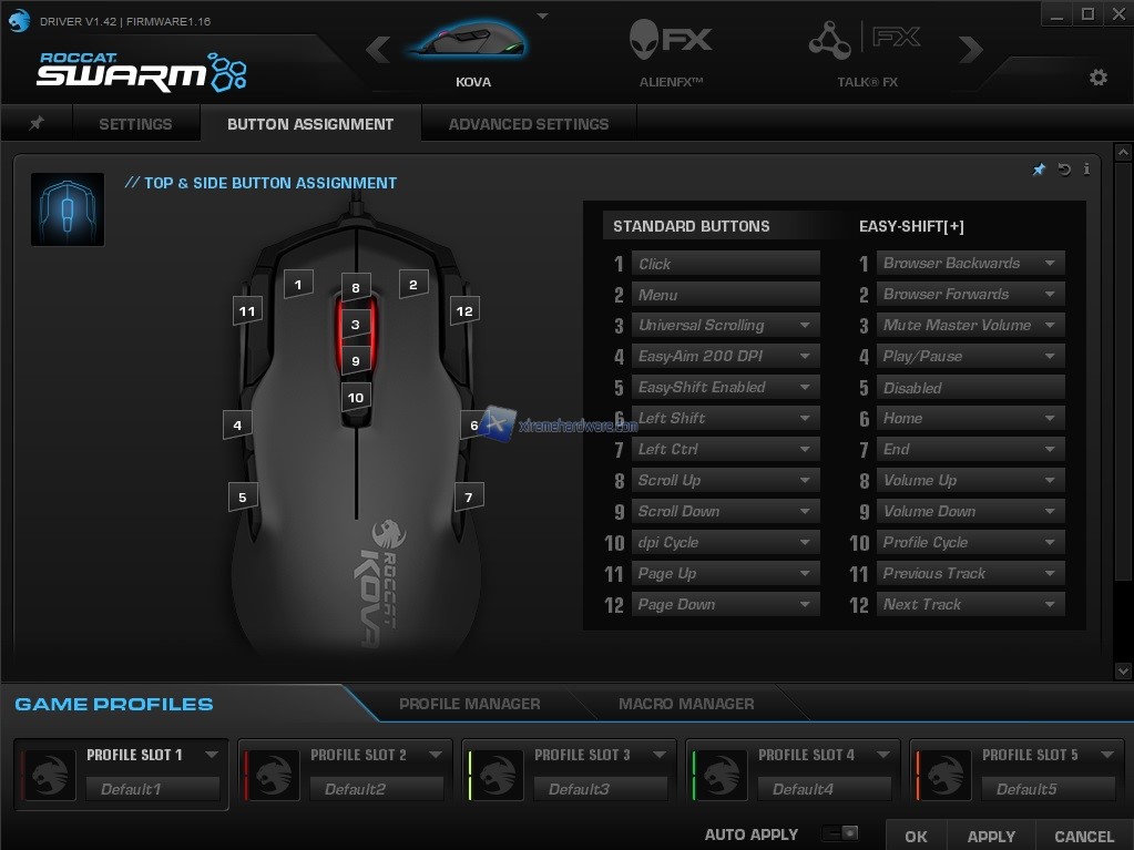 Tornando invece alla gestione dei tasti del mouse e precisamente nel Menù ‘’Button Assignment’’ come vediamo troveremo sempre un’immagine tridimensionale del mouse e a lato sia i 12 tasti principali sia quelli raddoppiabili grazie alla funzione ROCCAT EasyShift+. I diversi tasti potranno essere assegnati con funzioni multimediali, Macro, Browser e molto altro ancora.