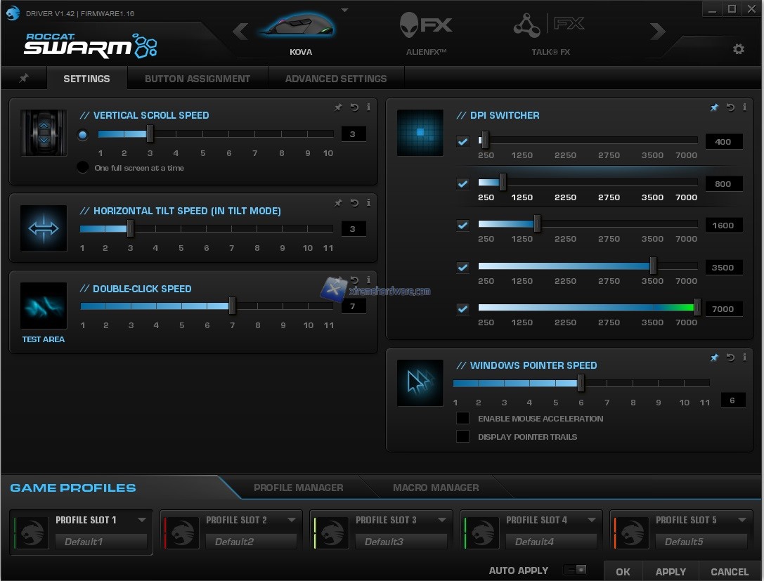 Nel Menù ‘’Settings’’ troveremo i più comuni parametri configurabili nonché i 5 step DPI di default che potranno essere modificati a nostro piacimento. Nel caso utilizzassimo una singola risoluzione DPI potremo impostare il valore e successivamente deselezionare le altre risoluzioni per evitare accidentali cambi di DPI in gioco. Funzione classica ma utile ai più. Notare anche l’ultimo step DPI con risoluzione di 7000 grazie alla funzione Overdrive che per interpolazione raddoppia i DPI massimi del sensore del KOVA 2016.