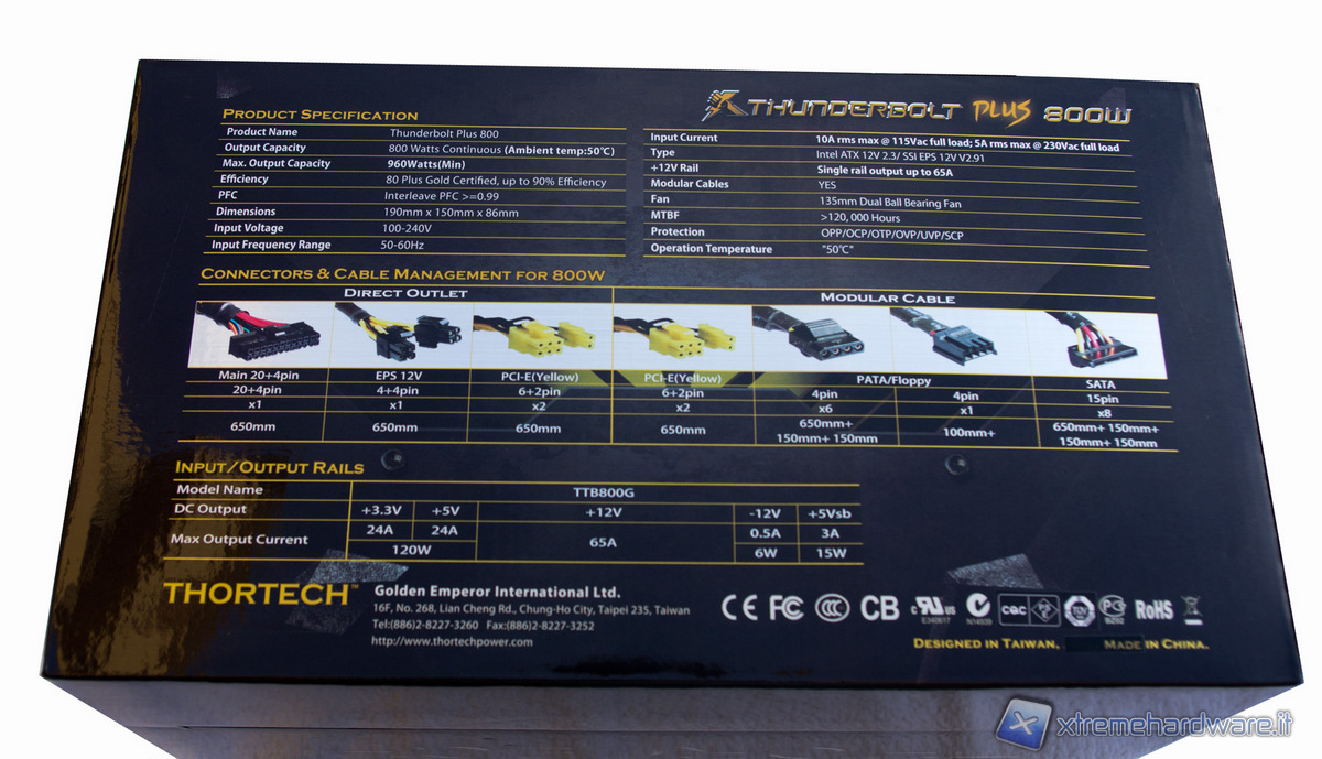 Nelle facce della scatola troviamo le indicazioni sulle caratteristiche tecniche e sulle qualifiche che il Thunderbolt ha ottenuto. In quella principale troviamo in evidenza la certificazione SLI e quella 80 Plus Gold, oltre ad un logo che ci indica i 5 anni di garanzia offerti dal produttore.