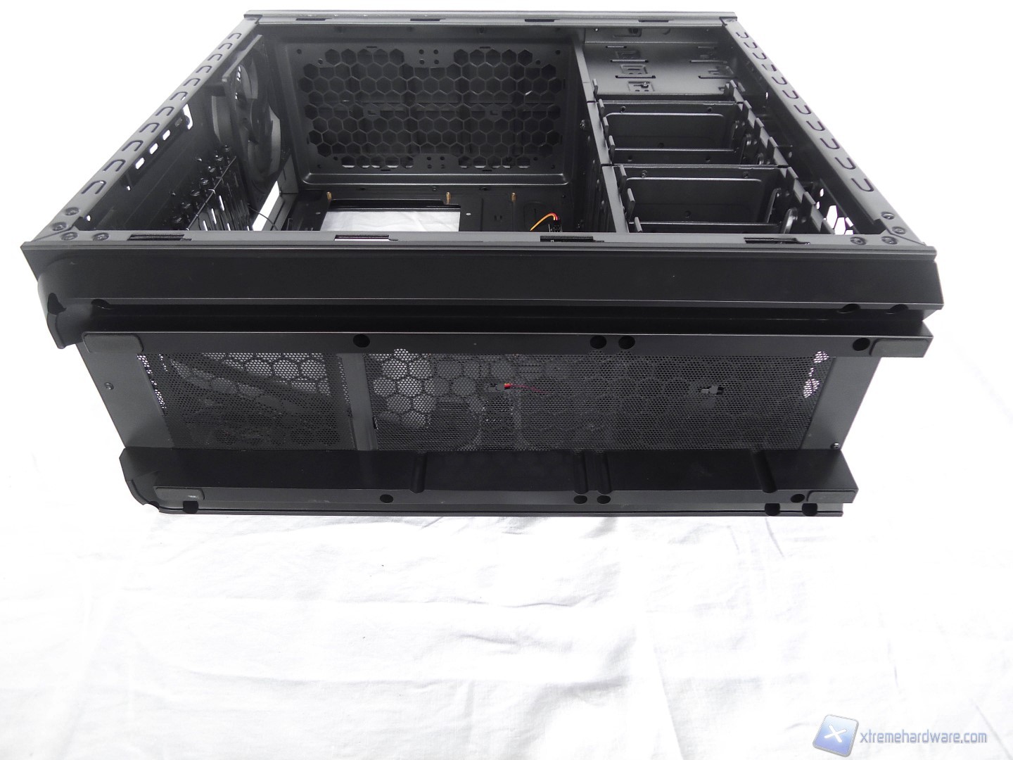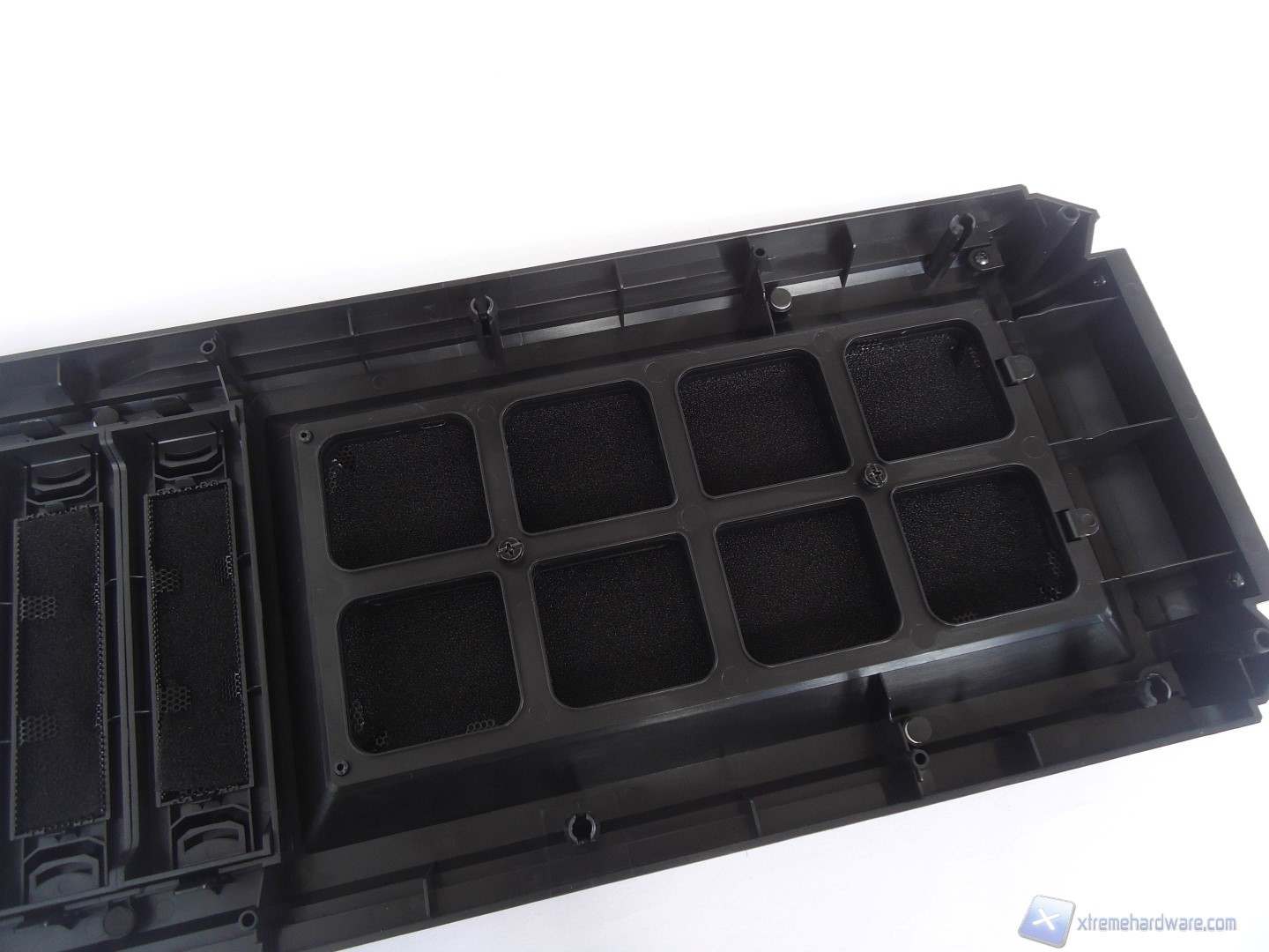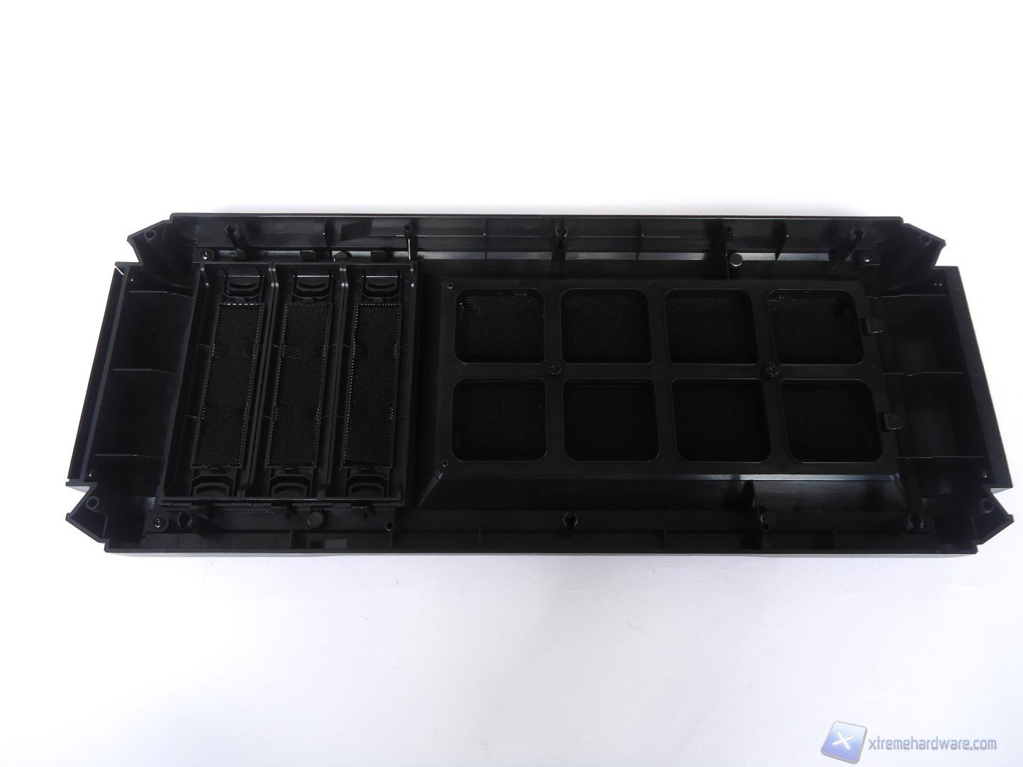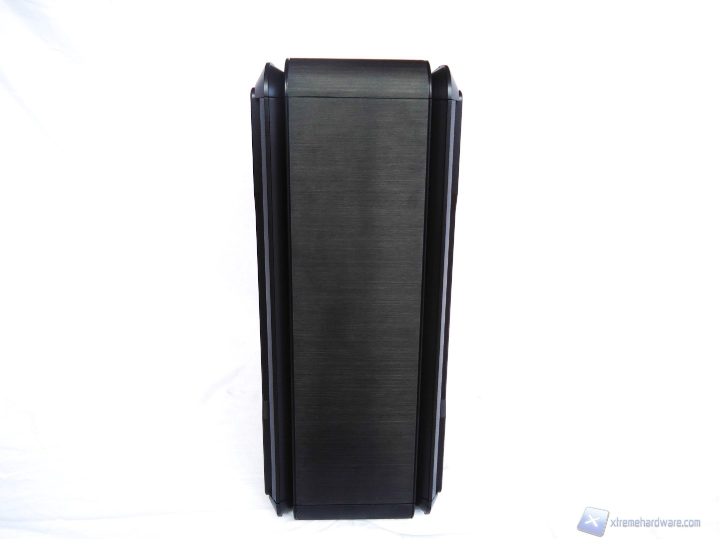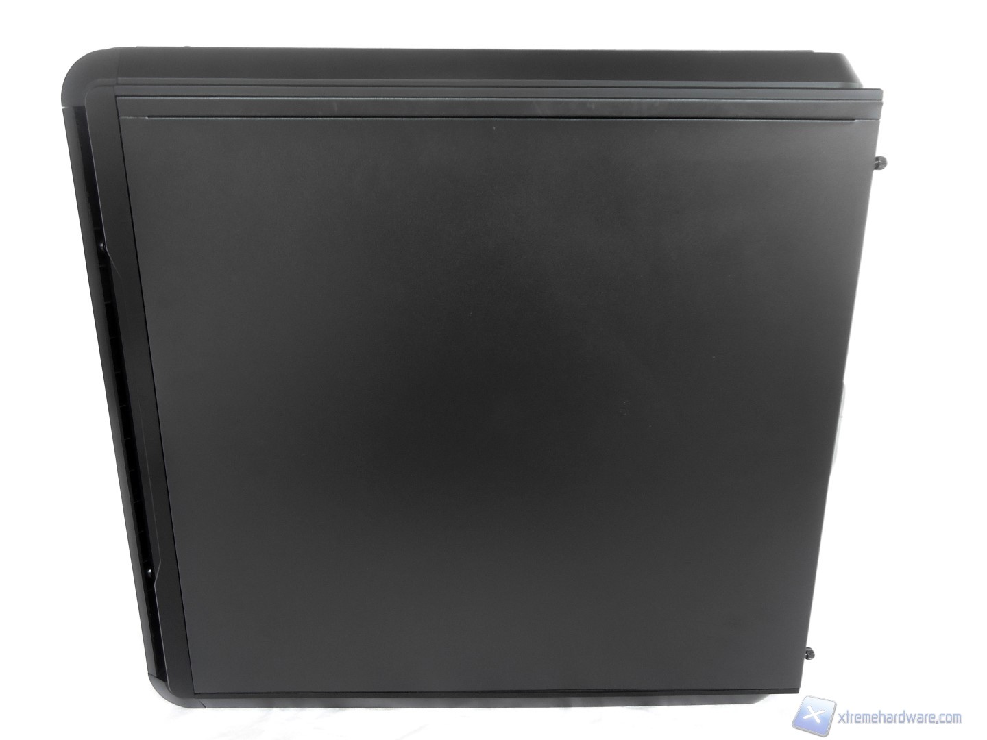 La parte superiore riprende le linee e il design della parte frontale, infatti presenta l’estensione della placca in alluminio spazzolato che abbiamo visto nel frontale. Sul top del case troviamo i vari tasti di accensione e reset oltre ai due led di stato, ma non mancano le connessioni USB che consistono in 4 USB 2.0 e 2 USB 3.0 e gli ingressi microfono e cuffie. Rimuovendo il top del case notiamo che è possibile installare superiormente due ventole da 120mm o da 140mm, anche se, contrariamente alla parte frontale, non disponiamo di un filtro antipolvere.