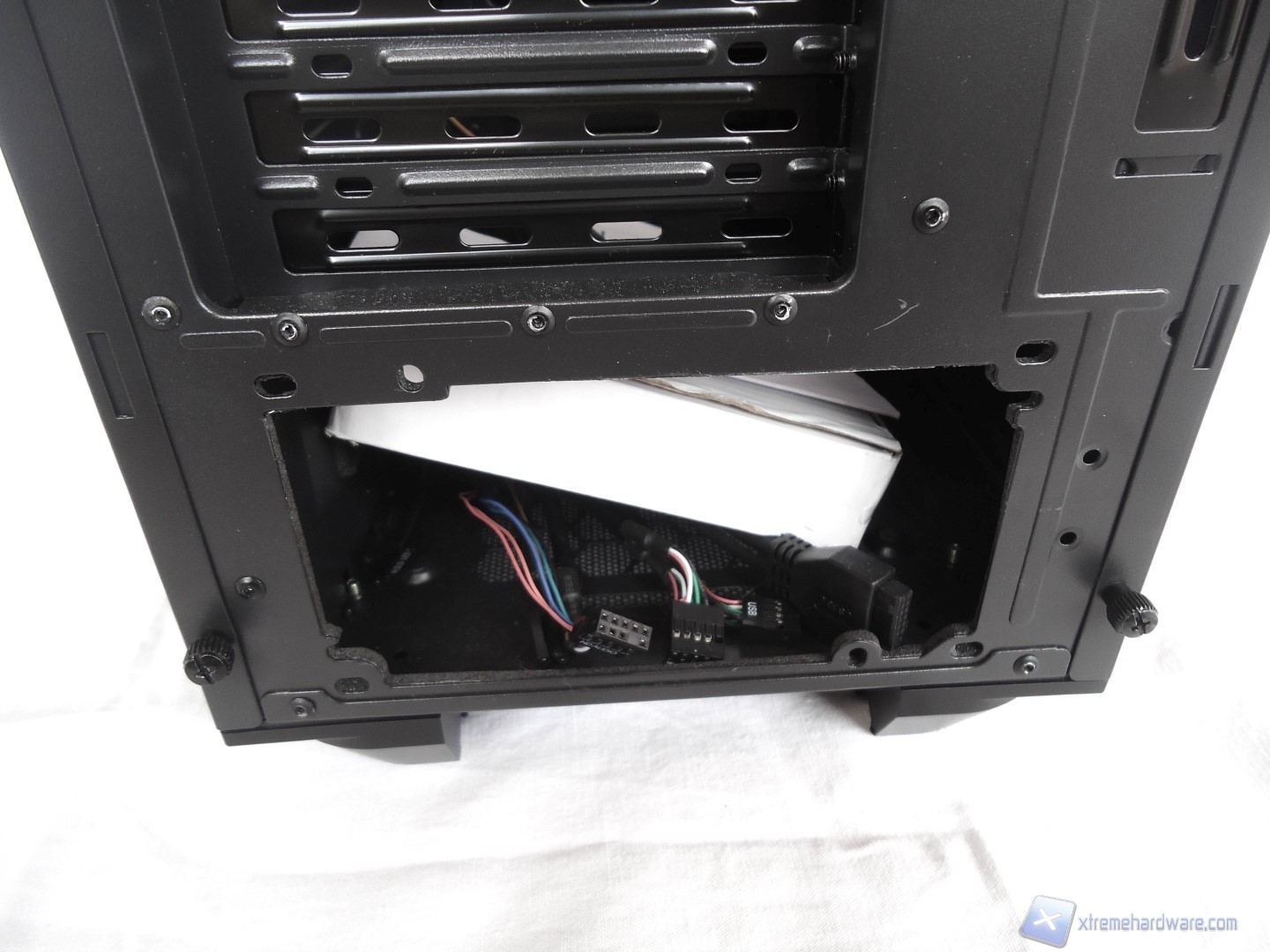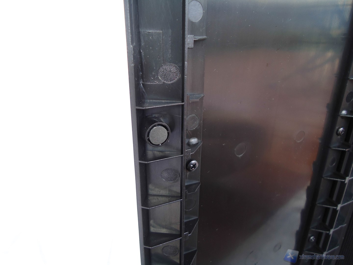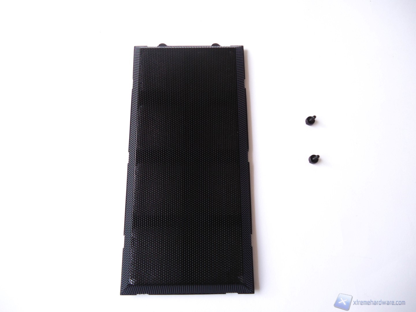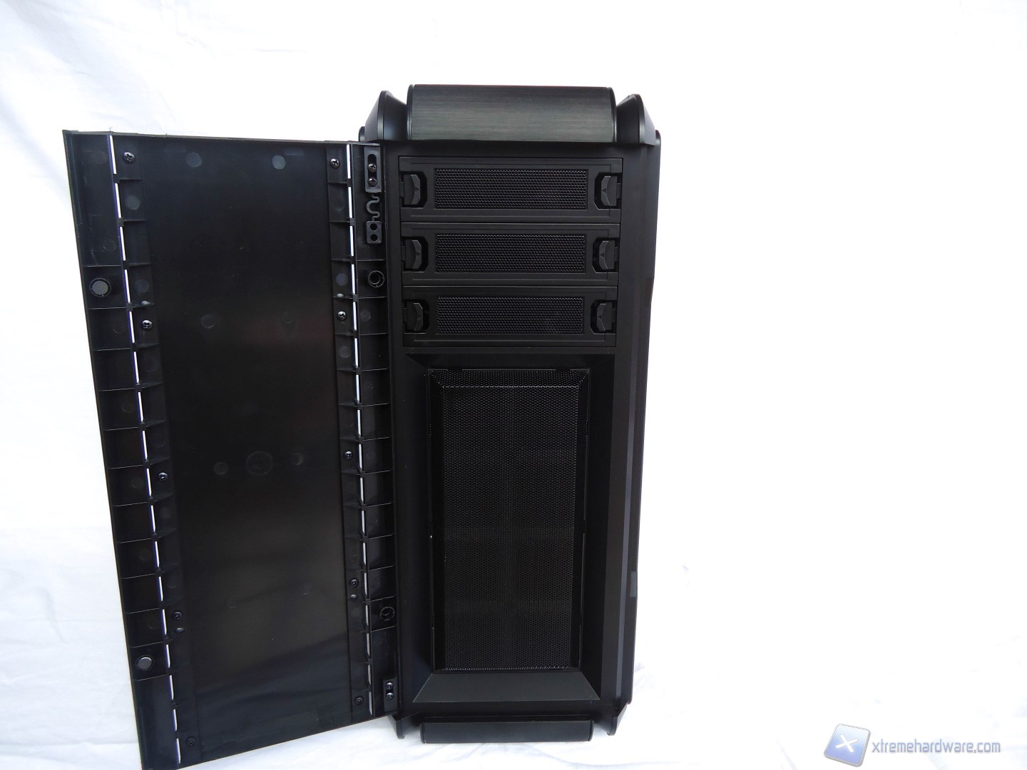 Come possiamo vedere dalle foto sottostanti il case presenta un frontale in alluminio spazzolato, che ne conferisce un aspetto molto elegante adatto anche ai salotti e uffici più ricercati. I lati del pannello frontale sono in plastica e grazie al loro design permettono di spezzare la linearità della parte frontale. Inoltre, nella parte sinistra troviamo i perni che ci permettono di aprire lo sportellino frontale che copre i bay da 5,25” e il filtro per le ventole anteriori. L’interno dello sportellino è realizzato in plastica e presenta due calamite sull’estremità destra che consentono una chiusura davvero salda. I copri bay da 5,25” sono forati e dotati di filtro antipolvere; si rimuovono facilmente premendone i lati come indicato dalle frecce. Più in basso troviamo una parte dedicata all’ingresso dell’aria per le ventole anteriori. Questa parte di acciaio forato presenta nella parte posteriore un filtro antipolvere removibile e lavabile. Per estrarre questo filtro dobbiamo per prima cosa rimuovere completamente il pannello frontale e successivamente svitare due viti presenti posteriormente al filtro. Si tratta senza dubbio di un’operazione un po’ laboriosa rispetto ad altre soluzioni della concorrenza. Togliendo la parte frontale mettiamo in mostra i fori delle ventole anteriori e la ventola da 140mm preinstallata.