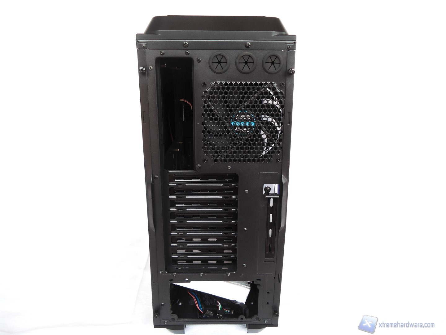Nel retro dell’Anidees AI6 possiamo notare una classica disposizione con l’alimentatore nella parte bassa del case e la scheda madre nella parte alta. In alto a destra troviamo la presenza di tre fori con relativi gommini che permettono il passaggio dei tubi per un eventuale impianto a liquido esterno. Il montaggio esterno di un impianto a liquido è da preferire in quanto come vedremo lo spazio all’interno di questo case è risicato, anche se è comunque possibile integrare un impianto composto da un radiatore da 240mm più un radiatore da 120mm. Proseguendo l’analisi della parte posteriore notiamo che sotto i fori per il passaggio dei tubi troviamo una ventola preinstallata da 120mm, un vero peccato la mancanza di compatibilità con lo standard 140mm. A sinistra della ventola troviamo il foro per l’installazione della I/O Shield della scheda madre. In seguito notiamo la presenza dei 7+1 slot PCI perforati, quindi potrebbe essere presente il fenomeno del “negative loop” orizzontale, tale per cui le temperature della scheda grafica possono aumentare a causa del potenziale ricircolo di aria calda dall’esterno. Ciò si verifica quando c’è un fenomeno di pressione negativa, ovvero sbilanciamento tra ventole in estrazione e in immissione, in favore delle prime. L’ottavo slot posizionato verticalmente si rileva molto utile in caso di installazione di schede che non richiedono di essere installate sulla scheda madre, come ad esempio una scheda di controllo LED priva di connessione PCI o PCI-E. Per finire, troviamo il classico foro per l’implementazione di un alimentatore ATX.