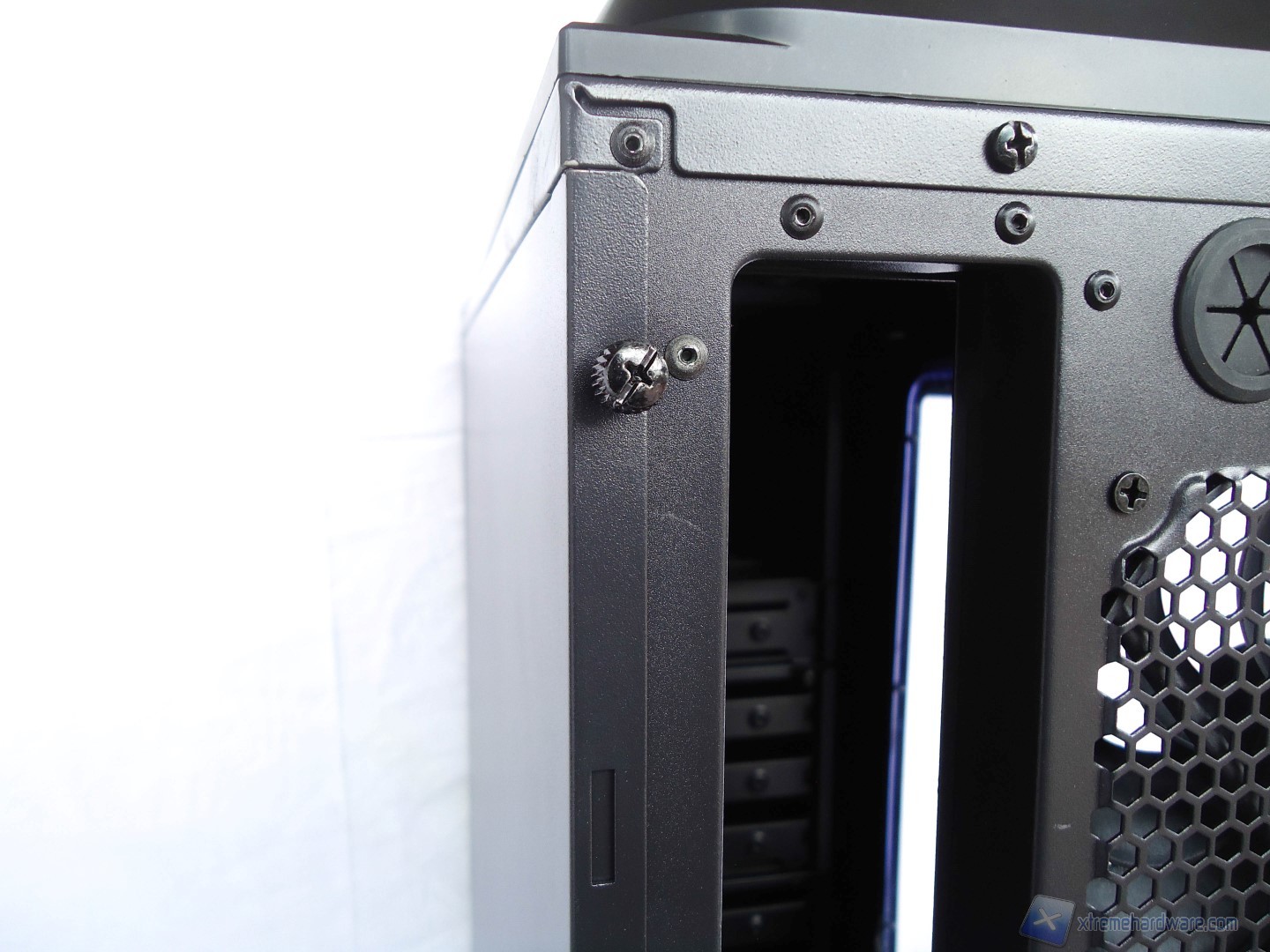 Come è facilmente visibile dalle foto, la paratia destra è classica, cioè priva di ogni foro o altre modifiche, quindi è completamente planare. Lo stesso non si può dire per la paratia sinistra che oltre a presentare nel nostro caso una finestra di discrete dimensioni che ci permette di visionare l’hardware installato, presenta anche il nome dell’azienda stampato in basso a destra. Le paratie sono di buona qualità e si flettono poco quando le prendiamo in mano. La verniciatura è di buona fattura e nonostante sia abbastanza ruvida al tatto non impedisce che le impronte rimangano sulla stessa. La rimozione delle paratie è facilitata dalla presenza di viti tool-less, ormai presenti anche nei case più economici.