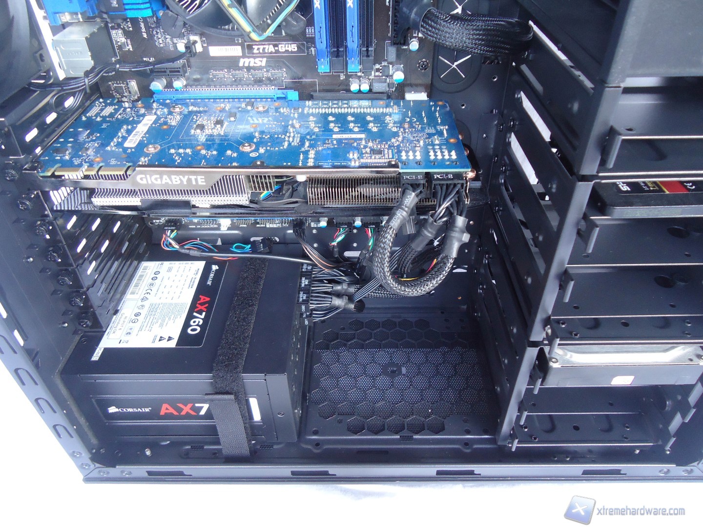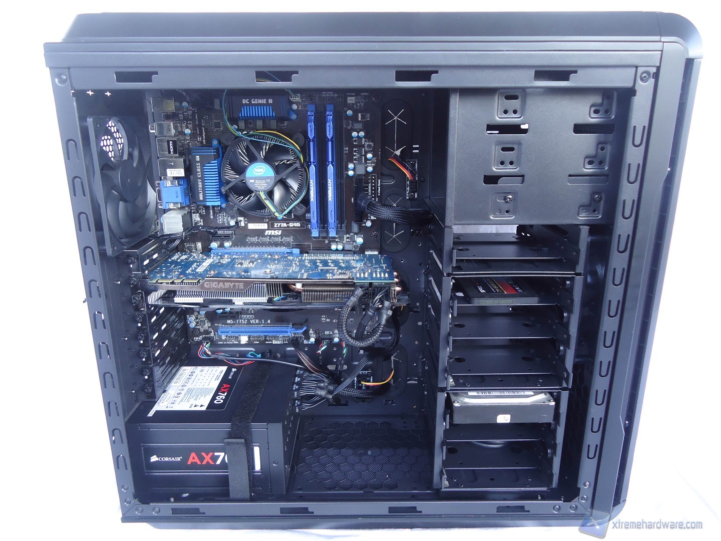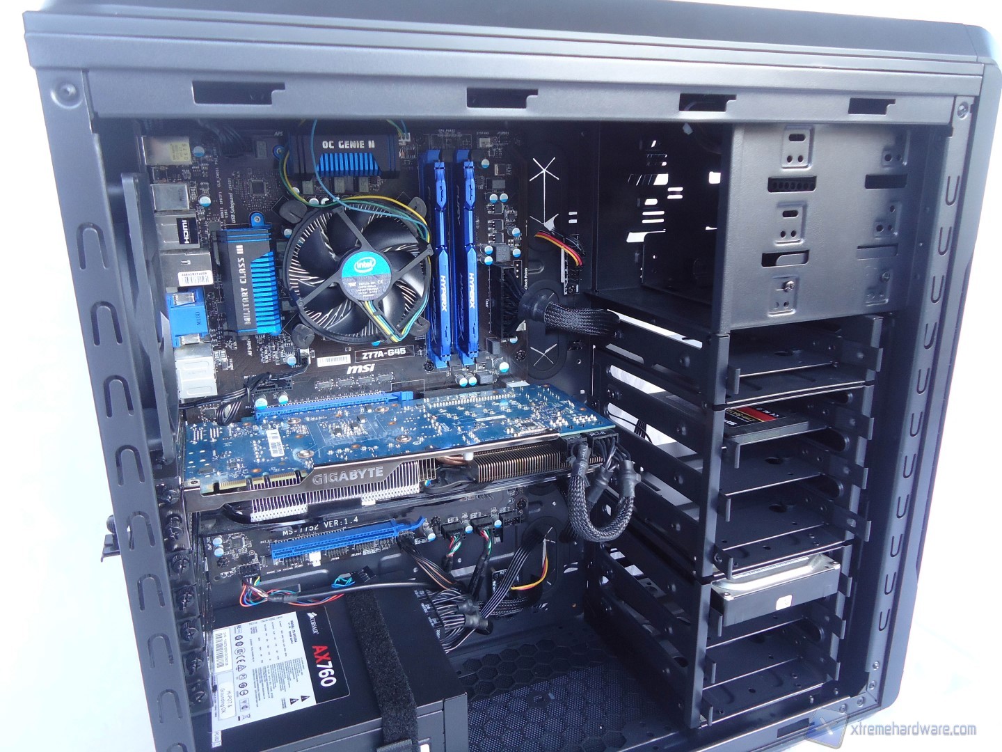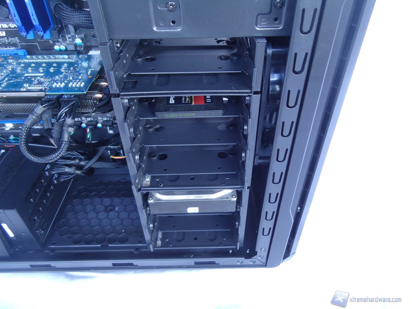 In questo paragrafo analizzeremo velocemente il montaggio di un sistema Intel ed il conseguente cablaggio posteriore ed anteriore. Anche per gli utenti poco esperti la procedura è molto facile: per prima cosa dovrete montare l’alimentatore alla base del cabinet, facendo attenzione a passare il connettore di alimentazione della scheda madre attraverso il retro del case insieme anche a quello ausiliario EPS ad 8pin. Nel nostro caso, come abbiamo detto precedentemente, siamo riusciti a stipare i cavi nella zona posteriore senza problemi ed inoltre il connettore 8pin EPS è possibile farlo passare agevolmente anche con scheda madre già installata nel case. Fatto questo, di solito consiglieremo l’installazione della scheda madre con relativo dissipatore montato e successivamente della scheda video, ma siccome disponiamo di un ampio foro posteriore possiamo montare il dissipatore direttamente con la scheda madre già montata nel case. Successivamente inseriamo i cestelli con gli SSD/Hard Disk precedentemente montati e colleghiamo il tutto.
