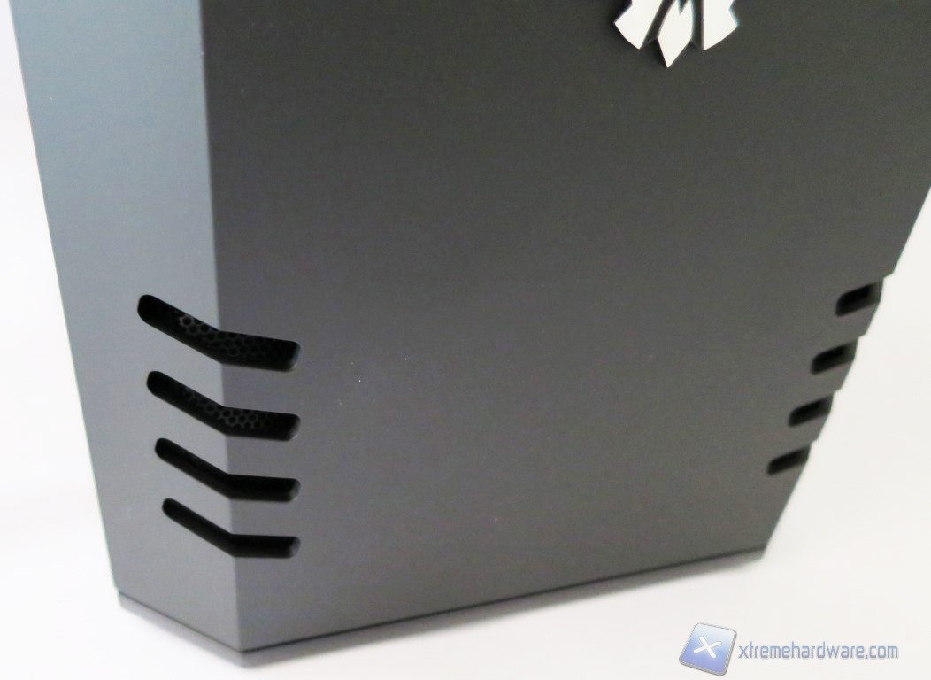 Il frontale del BitFenix Shadow è rivestito di una superfice Soft Touch molto bella al tatto ed alla vista. Spostandoci leggermente verso il basso possiamo notare il classico logo BitFenix in risalto ed ai lati alcune feritoie che sembrano le branchie di uno squalo, questo per rendere più aggressivo ma non meno elegante il BitFenix Shadow. La loro funzione principale è permettere il passaggio di aria fresca alle retrostanti ventole da 120mm. Il colore del frontale è completamente nero opaco, come per molti altri case dell’azienda taiwanese. Notiamo inoltre come il pannello frontale sia solo una semplice protezione per le unità da 5,25 pollici e per la griglia delle ventole: infatti, ci basterà aprire lo sportello/pannello per accedere al vero frontale composto da una griglia a più inserti per l’installazione di unità da 5,25 pollici. Tali griglie sono dotate di comodi filtri antipolvere. La griglia inferiore, dotata di filtro antipolvere in spugna per due ventole da 120mmm, si rimuove con due semplici click, premendo semplicemente verso l’interno. Questo perché la griglia è dotata di due fermi agganciati a due supporti nella parte interna del case. La rimozione e la pulizia del filtro è pertanto molto semplice. Dietro tale griglia si cela la ventola da 120 millimetri preinstallata ed è possibile montare un’ulteriore ventola, sempre da 120 millimetri. Analizzando la parte top/frontale troviamo le connessioni USB ed i vari pulsanti. Nel dettaglio troviamo partendo da sinistra le spie attività del PC e del nostro Hard Disk, due porte USB 3.0, due porte USB 2.0, il tasto per cambiare colore ai LED, il tasto per spegnere l’illuminazione a LED, il classico tasto per l’accensione e per finire quello del Reset. La parte superiore del BitFenix Shadow, invece, non presente aperture o griglie per l’installazione di radiatori o ventole aggiuntive nella parte alta del case.