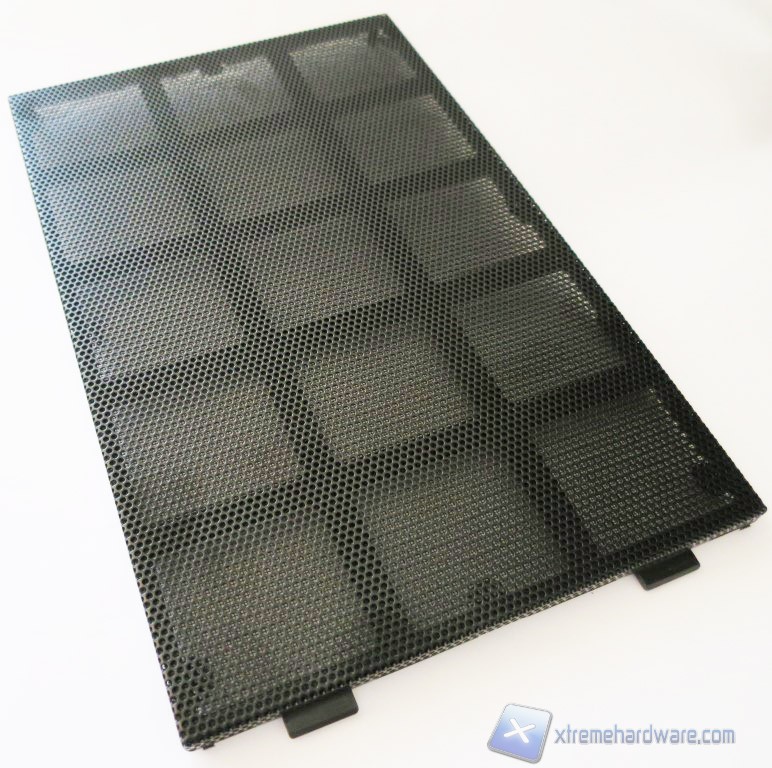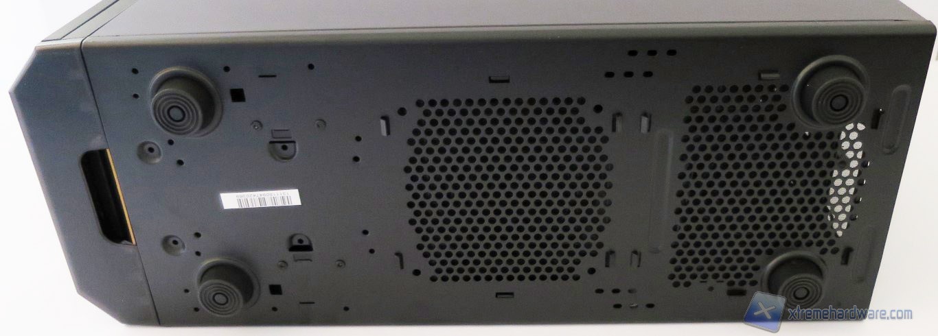 La paratia inferiore del BitFenix Shadow è semplice e non presenta features particolari se non per i due filtri antipolvere interni (che vedremo nel dettaglio nei prossimi capitoli) in corrispondenza della ventola dell’alimentatore. Il filtro è facilmente removibile e lavabile in modo da averlo sempre pulito e assicurare sempre il miglior ricircolo d’aria. Il BitFenix Shadow è dotato inoltre di classici piedini in plastica con una buona altezza tale da consentire un flusso d’aria nella parte bassa del case quando lo avremo appoggiato sulla scrivania o per terra.