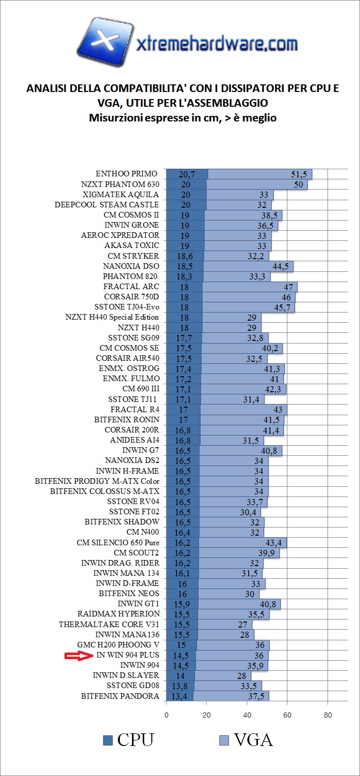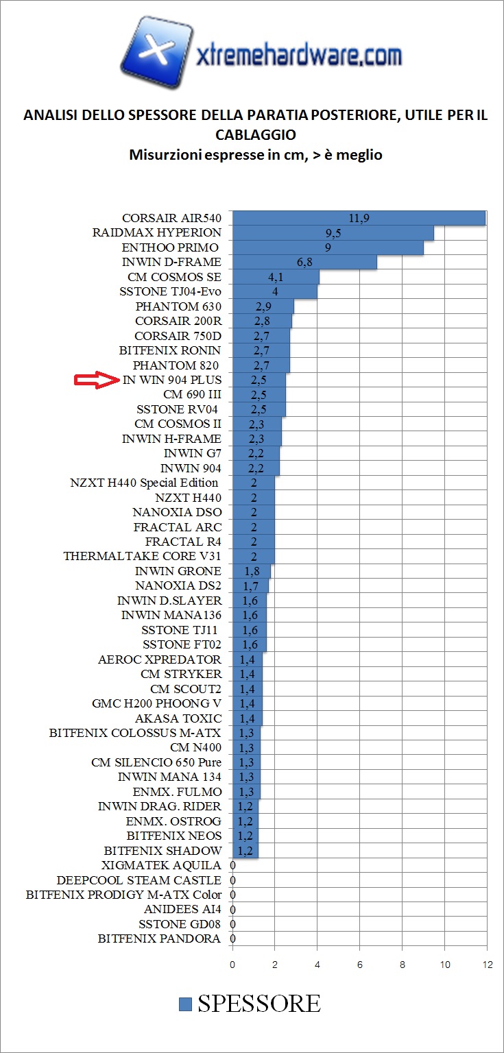 Per quanto riguarda la rumorosità complessiva l’In Win 904 Plus non è comprensivo di ventole dunque starà a noi scegliere quali modelli e ventole montare tenendo conto la compatibilità con una sola ventola da 120 o 140 nel fondo del case e una da 90 mm nel caso in cui montassimo un dissipatore ad aria sulla scheda madre.