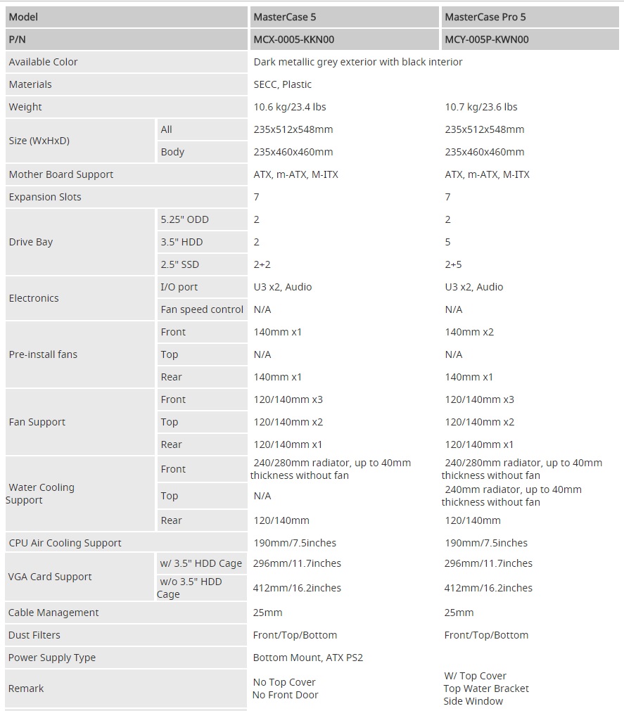 Con la nuova serie Cooler Master MasterCase come abbiamo detto si apre una nuova era di come personalizzare al meglio il proprio PC a partire dal case e da quello che potremo inserirvi. I modelli della serie MasterCase si somigliano molto infatti i due case ovvero MasterCase 5 e MasterCase Pro 5 sono accumunati da alcuni elementi imprescindibili quali aspetto esteriore e dimensioni. A seguire Midplate, numero di ventole installabili, formati di schede madri installabili e molto altro come vediamo dalla tabella delle specifiche qui sopra. Se tutto è identico per entrambi i case la differenza risiede nell’espandibilità del primo e nella configurazione accessoria di base del secondo. Vedremo meglio nel corso di questa recensione questi aspetti. Brevemente ricordiamo comunque che la serie di case MasterCase 5 può ospitare facilmente schede madri in formato ATX e più piccole nonché radiatori con dimensioni massime di 280mm e 40mm di spessore (nel frontale soltanto per il modello MasterCase 5 in quanto privo di supporto accessorio per radiatori nel Top come per la versione Pro 5). Anche per questo aspetto vi rimandiamo ai prossimi capitoli nel corso della recensione.