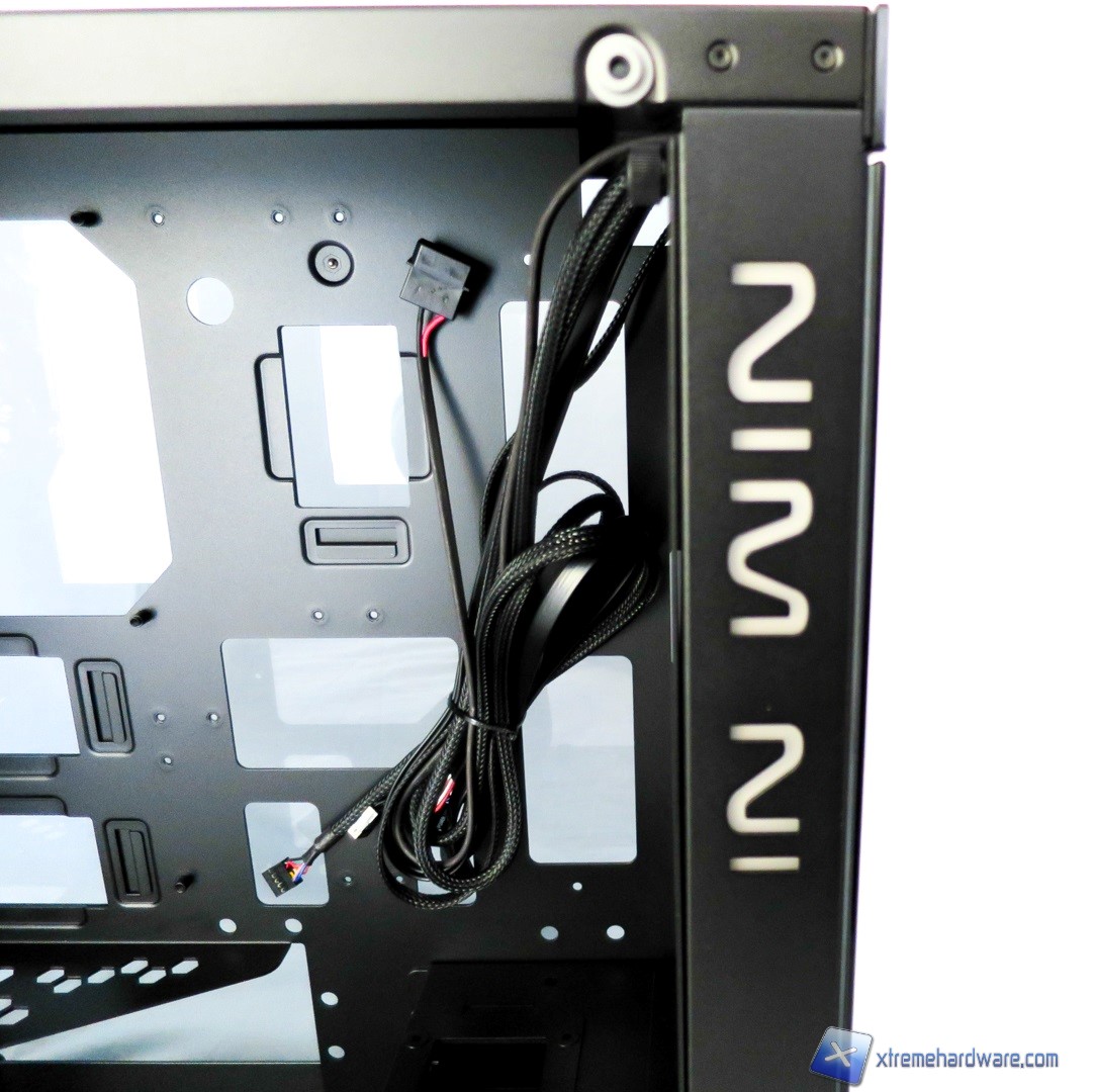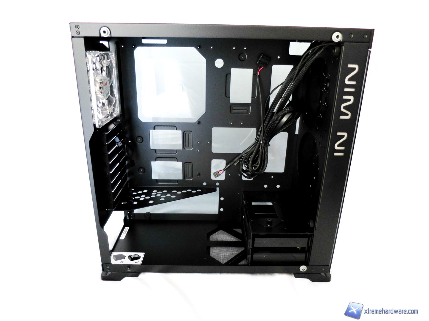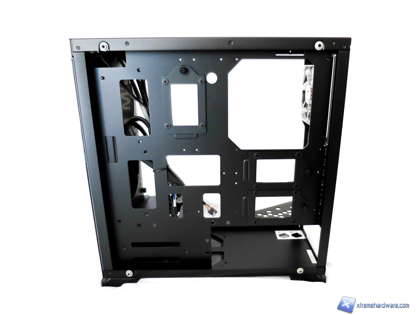 Per accedere all’interno del case ci basterà dunque svitare le 8 viti, 4 per lato che terranno i due pannelli in vetro temperato. Rimossi con attenzione i pannelli, potremo accedere dunque all’interno del case che vediamo essere molto organizzato ed ottimizzato per una configurazione di fascia alta ed eventualmente con impianto a liquido vista la predisposizione e modularità di alcuni pannelli e del cage degli Hard Disk.