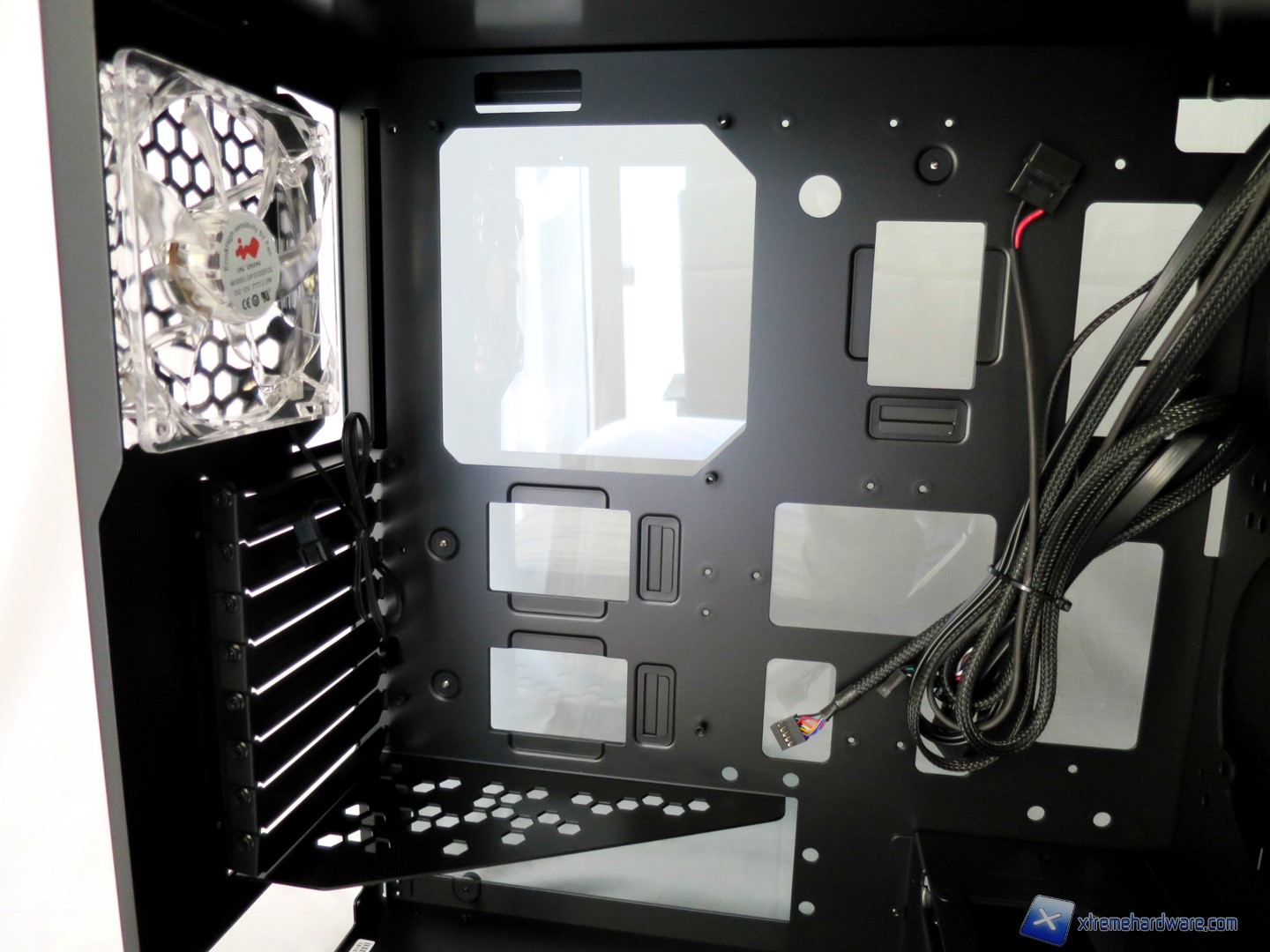 Osservando meglio l’interno del case, possiamo vedere come il tray della scheda madre e più precisamente il supporto in acciaio sia caratterizzato da diversi fori per effettuare un cable management dei cavi provenienti dall’alimentatore e dal frontale e per ospitare nella zona posteriore i tre supporti per SSD. Possiamo osservare anche come il foro per installare un eventuale backplate sia di buone dimensioni e ci permetterà di installare o rimuovere eventuali dissipatori senza smontare la scheda madre dall’interno del case.