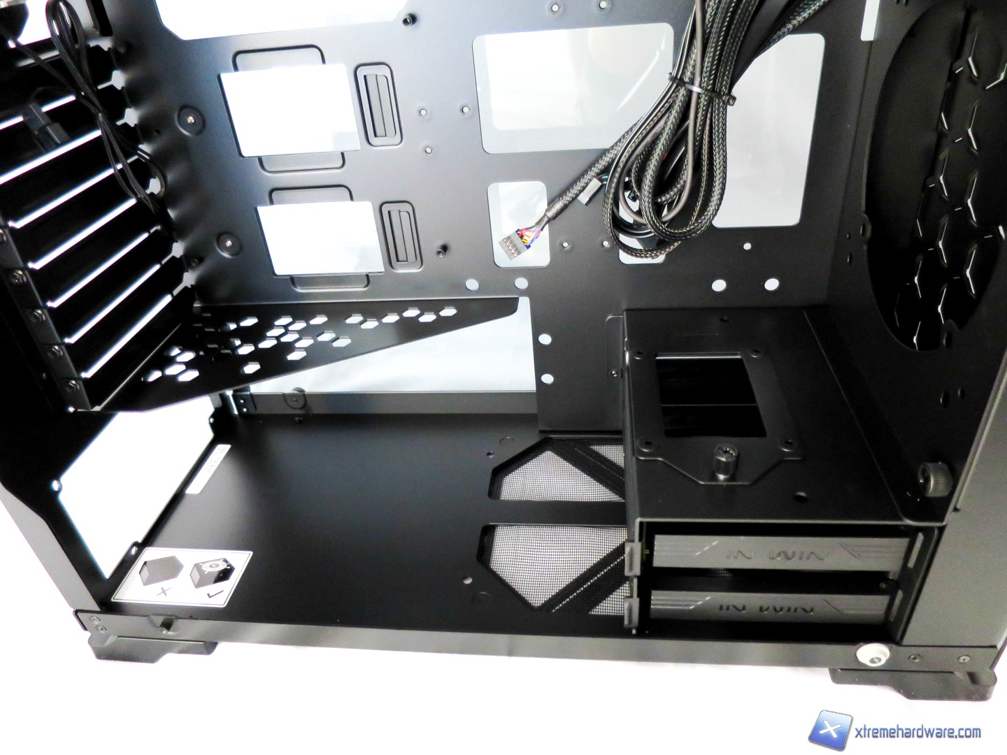 Proseguendo verso il basso non possiamo non notare la zona adibita all’installazione dell’alimentatore con ventola rivolta verso l’alto come ed anche suggerimento di In Win a mezzo adesivo sul fondo del case.