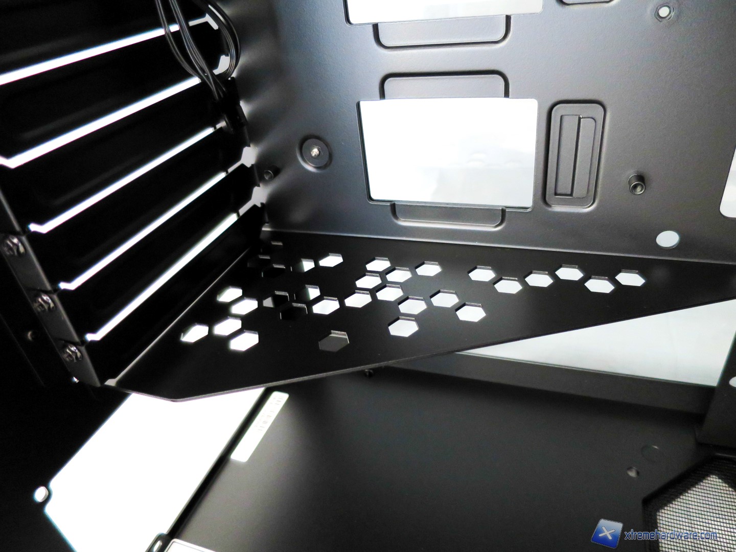 Proseguendo verso il basso troviamo una sorta di rinforzo in metallo forato con un gradevole look che permetterà sia di irrigidire la struttura sia di separare visivamente la zona dell’alimentatore da quella della scheda madre e delle schede video.
