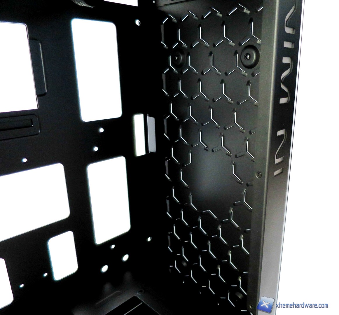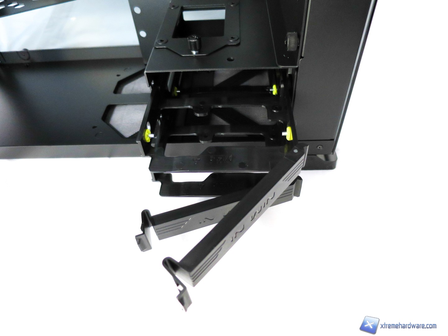 Infine, spostandoci nella paratia laterale destra interna, possiamo osservare come questa sia caratterizzata da un supporto in metallo per ospitare la seguente configurazione ventole 2x120mm o 2x140mm in aggiunta al cage degli Hard Disk da poter montare in verticale zona interno case. Così facendo potremo avere un’ampia modularità a seconda della configurazione da installare nell’In Win 805. Ricordiamo che il supporto in metallo potrà essere rimosso nel caso non ne abbiate necessità grazie a due viti Tool-less.