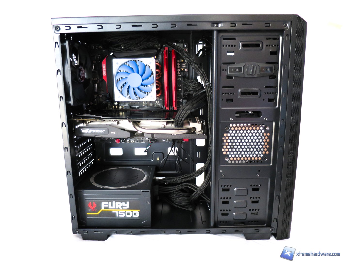 Al solito abbiamo proceduto ad installare la nostra configurazione e abbiamo visto come seppur il BitFenix Nova sia un case economico, con la dovuta pazienza e accortezza ci ha permesso di installare senza problemi tutti i componenti. Lo spazio sicuramente non è il punto forte di questo case ma siamo riusciti a cavarcela senza troppi problemi. Diciamo senza troppi problemi in quanto il foro per il passaggio del cavo di alimentazione ausiliaria 8 pin EPS nel nostro caso, utilizzando un alimentatore BitFenix Fury, non ci ha permesso il passaggio tramite tale foro e quindi abbiamo dovuto farlo passare lateralmente e frontalmente. Per il resto anche la scheda video GTX 970 Strix ha trovato facilmente la sua collocazione senza problemi ed il cablaggio è stato organizzato tra il retro del case ed il fondo del case stesso.