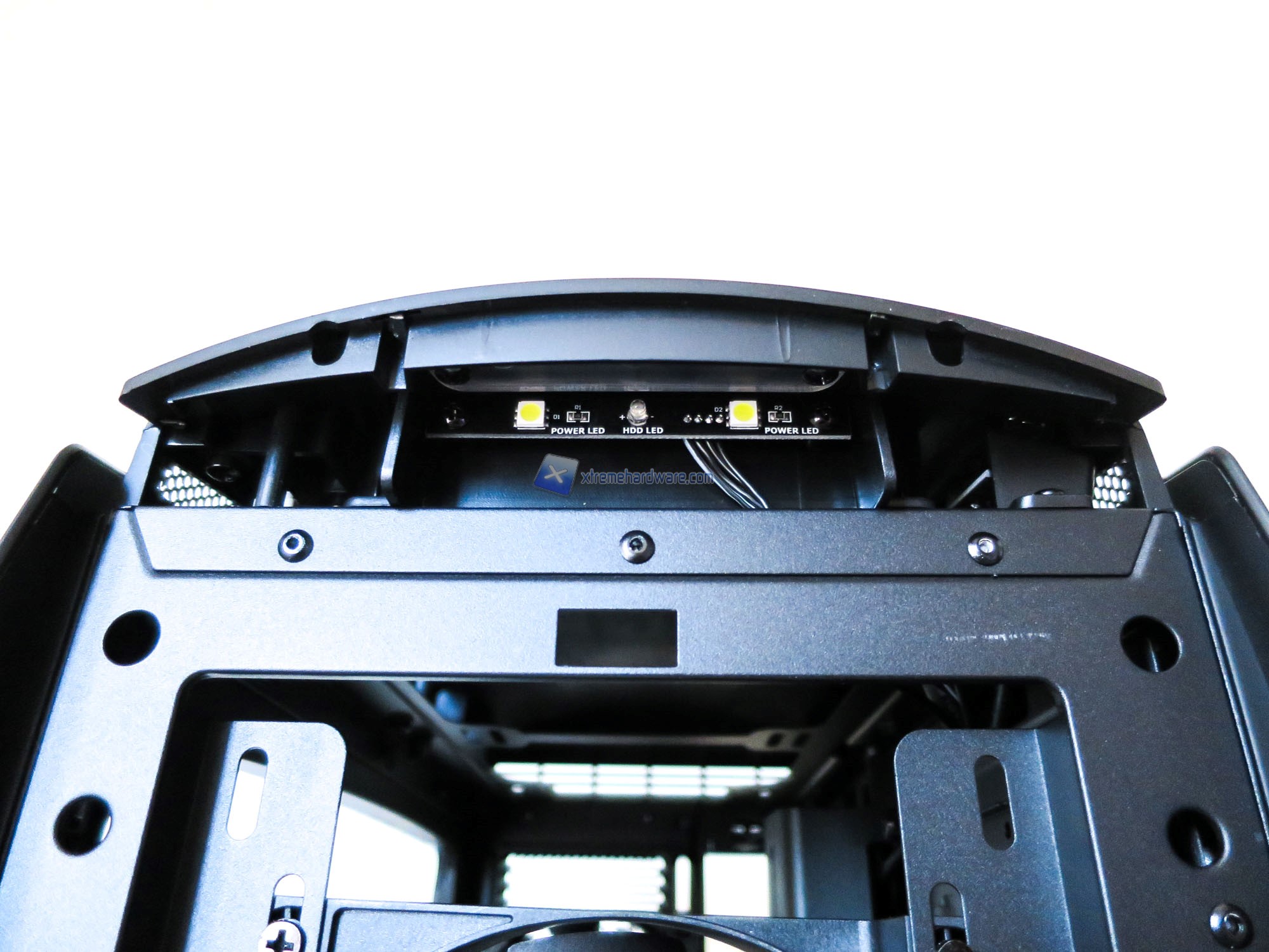Avendo rimosso il pannello frontale, possiamo notare anche la presenza di due LED SMD (Colore Bianco) presenti in una sorta di supporto superiore. Questi LED retroillumineranno una striscia in plastica presente nella parte superiore del case. Come vedremo a seguire, anche nel retro del case sono presenti altri due LED identici per completare insieme all’ultimo LED posto in corrispondenza della scritta NZXT sul Midplate la retroilluminazione dell’NZXT Manta.