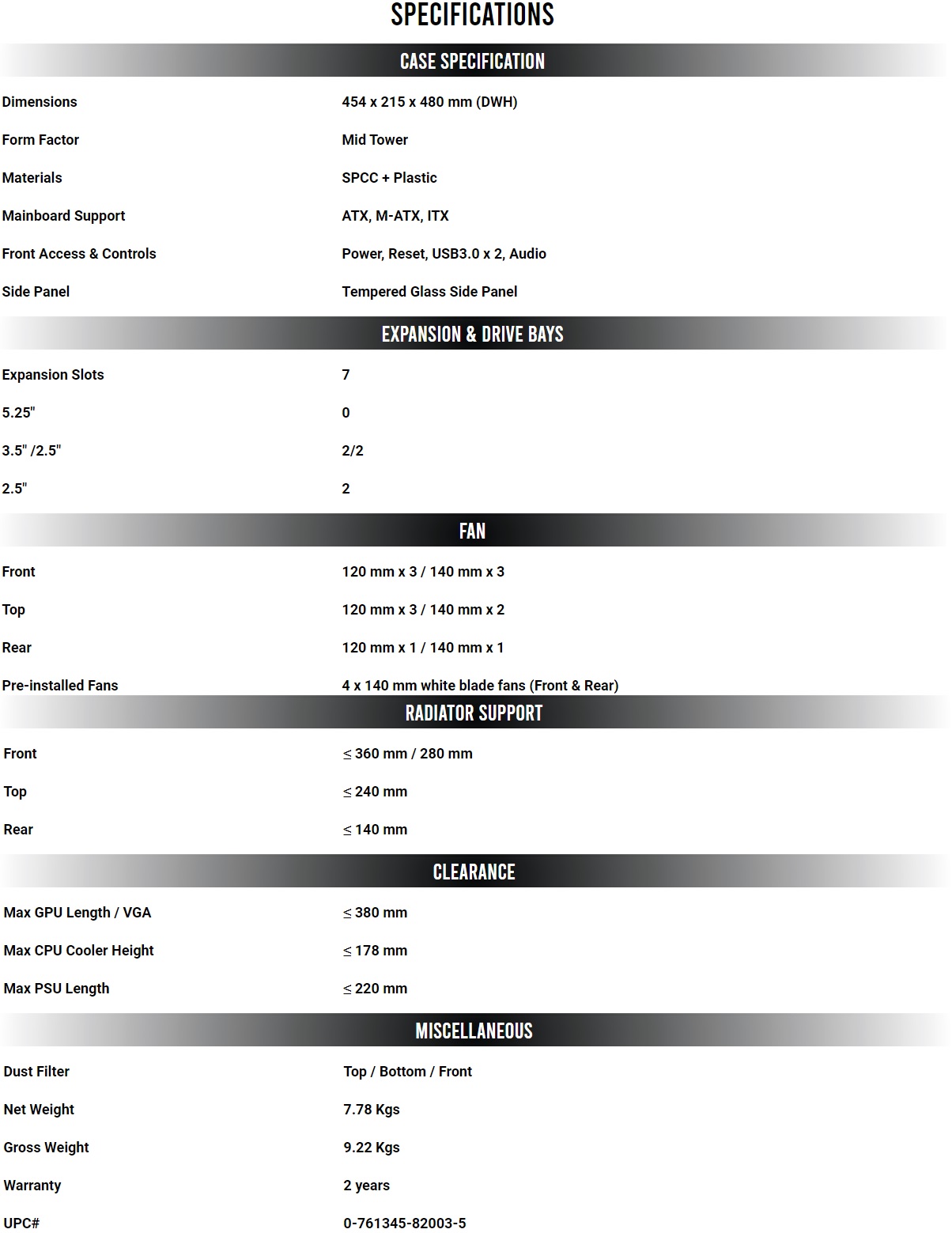 Proseguendo riportiamo a seguire le specifiche tecniche del Antec P82 Flow: