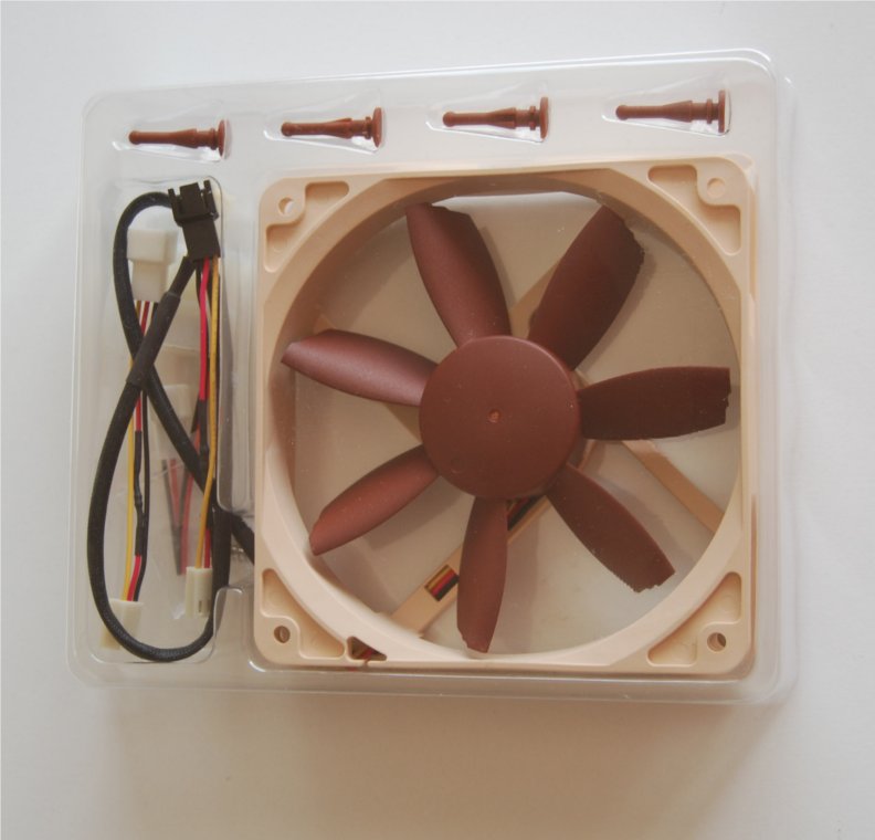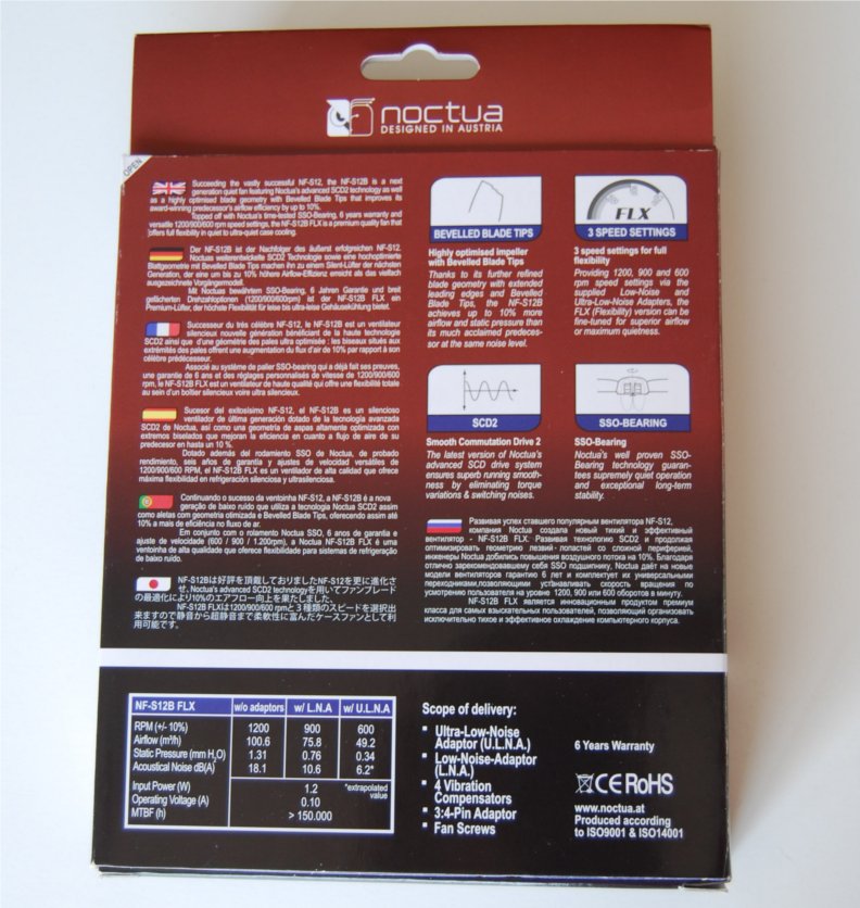 La NF-S12B è una ventola da 120mm di diametro per 25mm di spessore. La ventola si trova in una confezione di cartone che lascia intravedere parte della ventola. Sul retro della confezione sono presenti dei grafici e dei disegni che illustrano le caratteristiche della ventola.