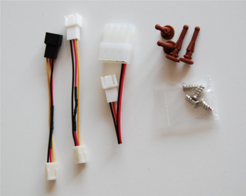 Nel bundle vengono forniti 3 adattatori: un adattatore 3 pin-->4pin ("molex") e due connettori a 3 pin che permettono di abbassare il voltaggio fornito alla ventola e conseguentemente la velocità di rotazione e il rumore prodotto (Low Noise Adaptor e Ultra Low Noise Adaptor).