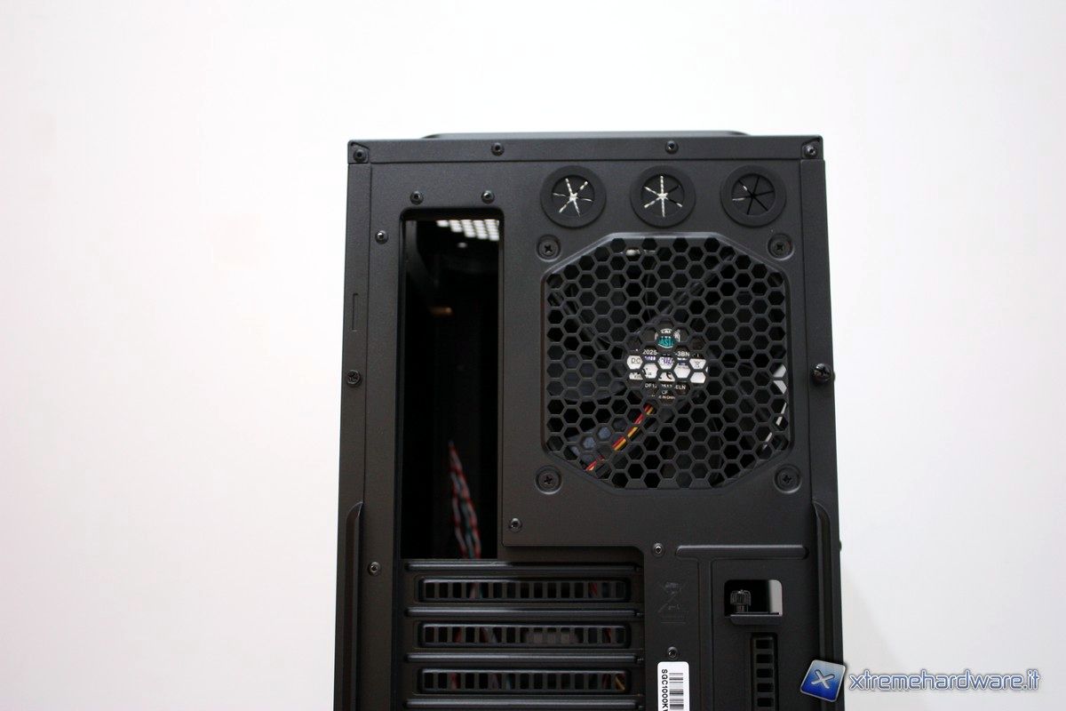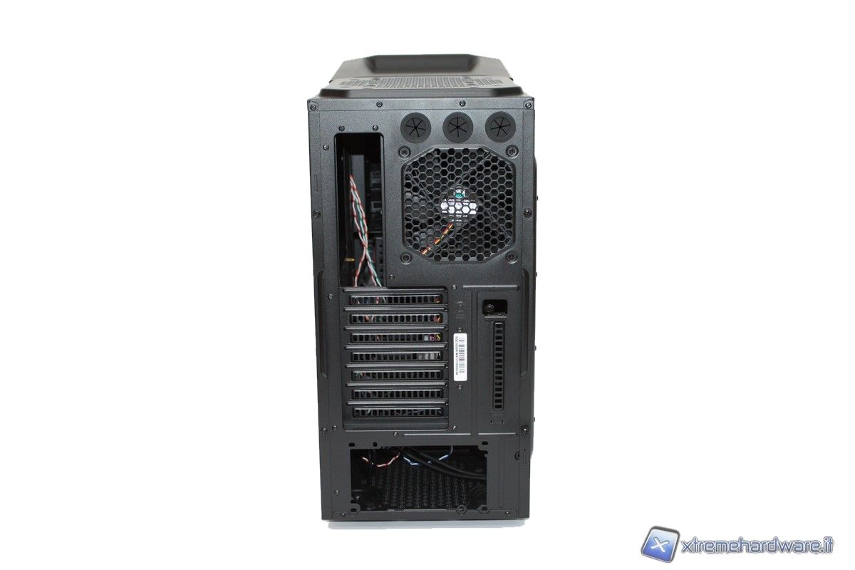Posteriormente abbiamo infatti la presenza di tre fori, dotati di guaina protettiva, per il passaggio dei cavi di un eventuale impianto a liquido e una ventola (in dotazione) da 120mm in estrazione, molto silenziosa e performante.