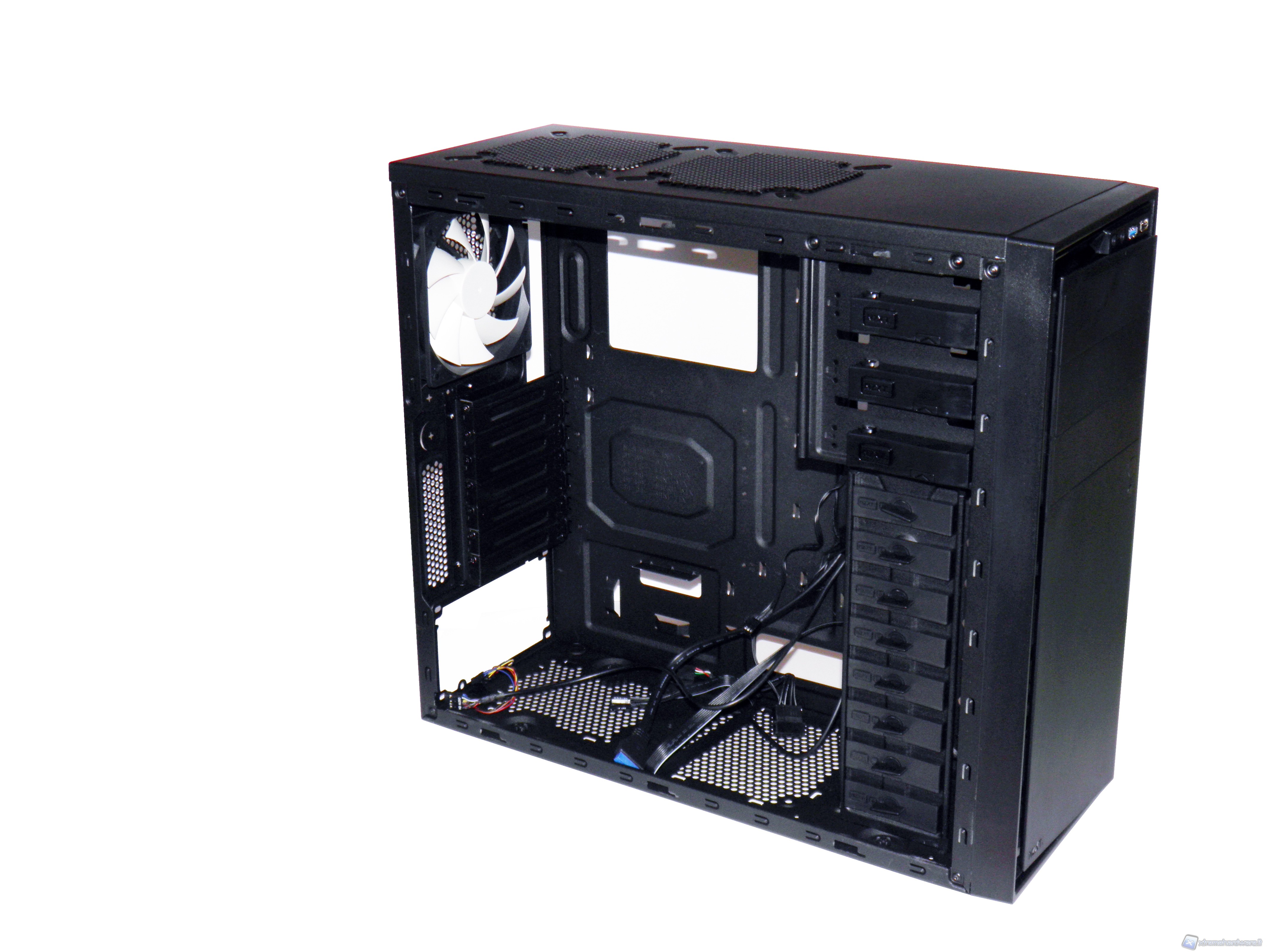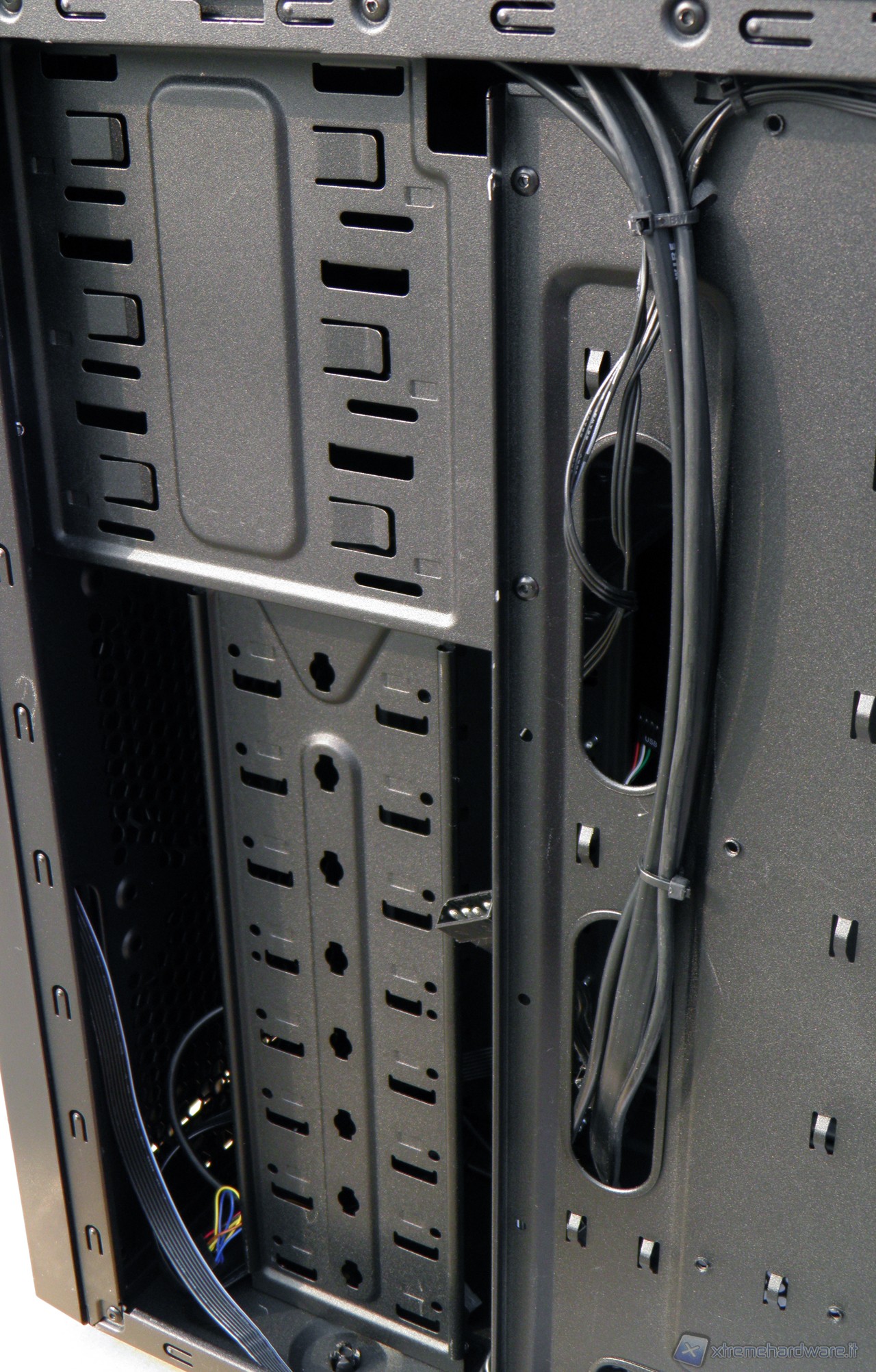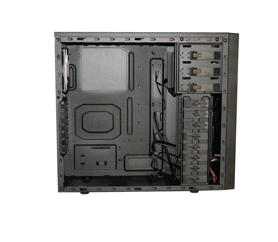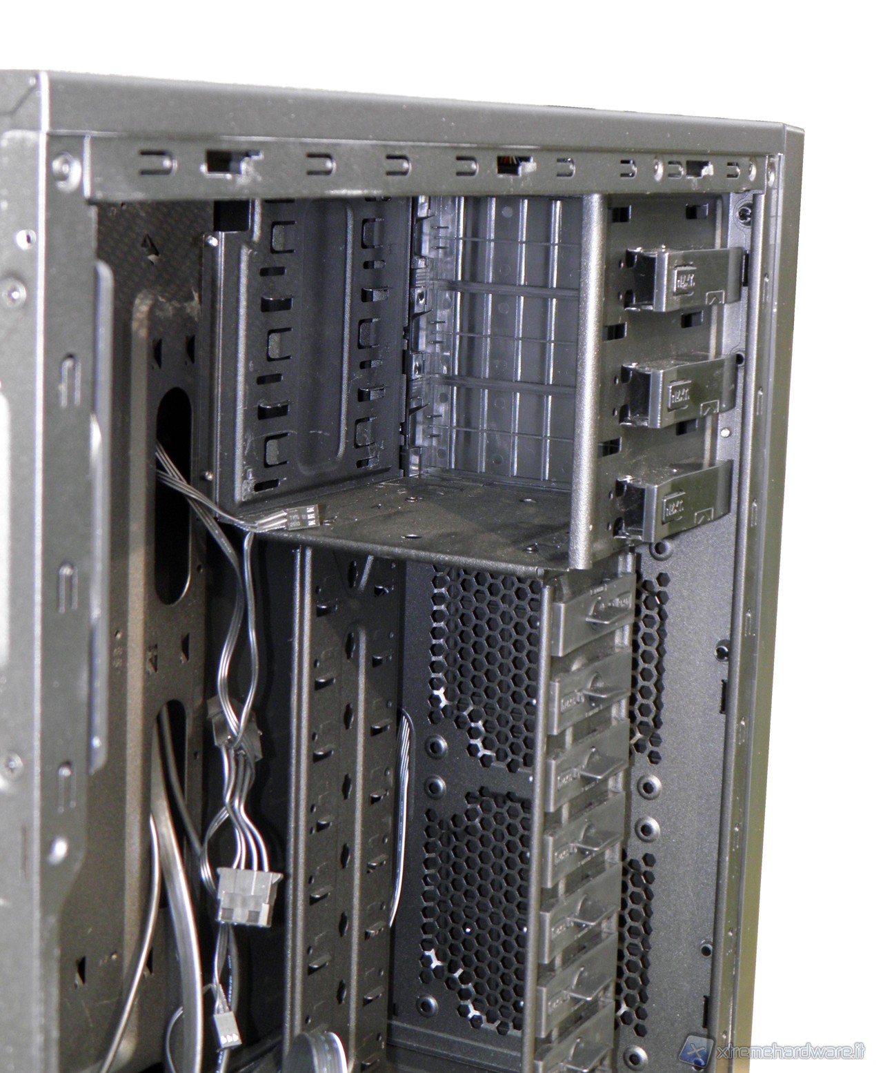 Nella parte anteriore appaiono invece gli 8 supporti per unità da 3.5'' e i 3 per unità da 5.25'',  tutti longitudinali rispetto al case. Questa scelta rende potenzialmente problematica l'installazione/rimozione di unità da 3.5'' nel caso di eventuali schede di espansione già installate.