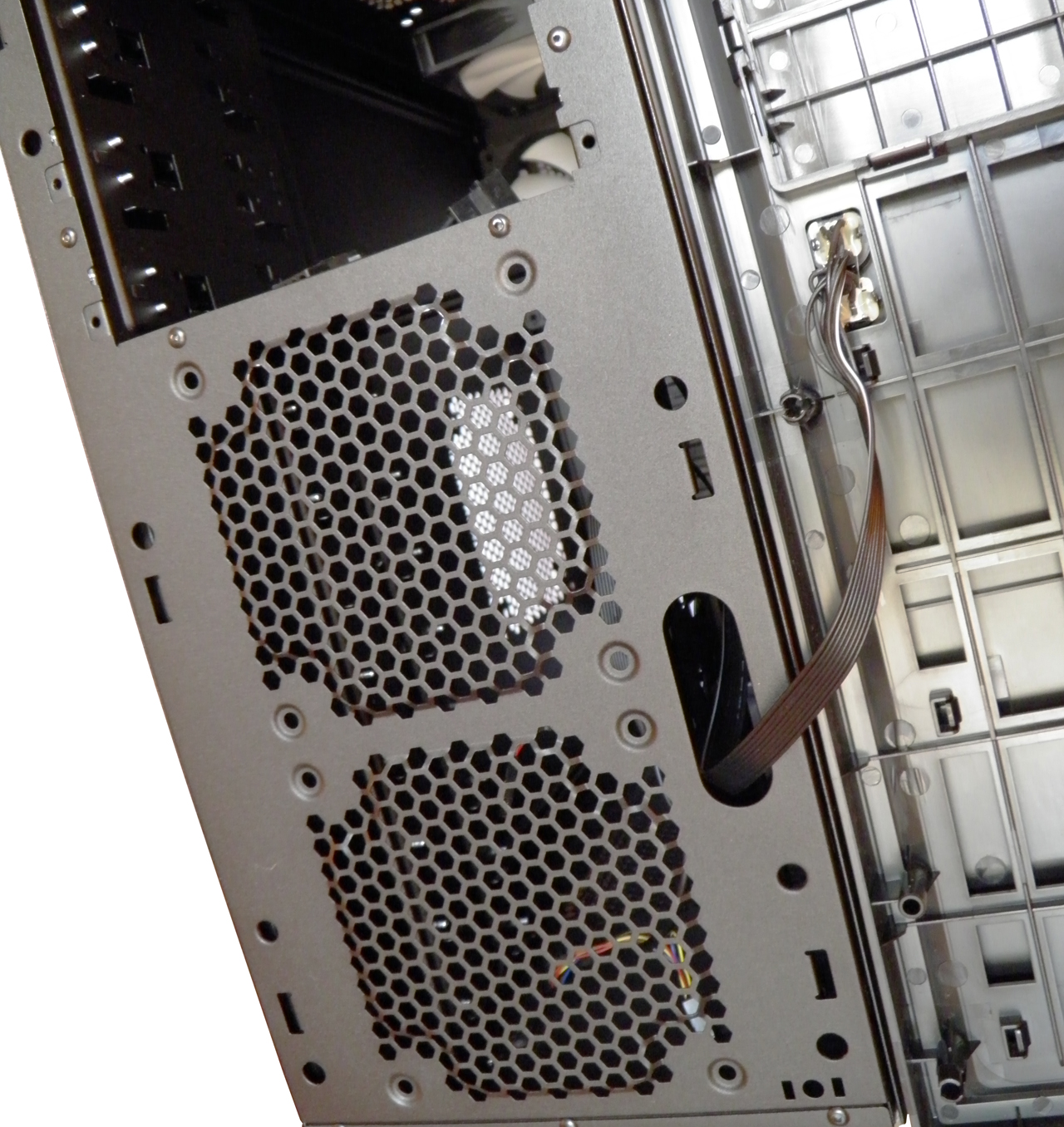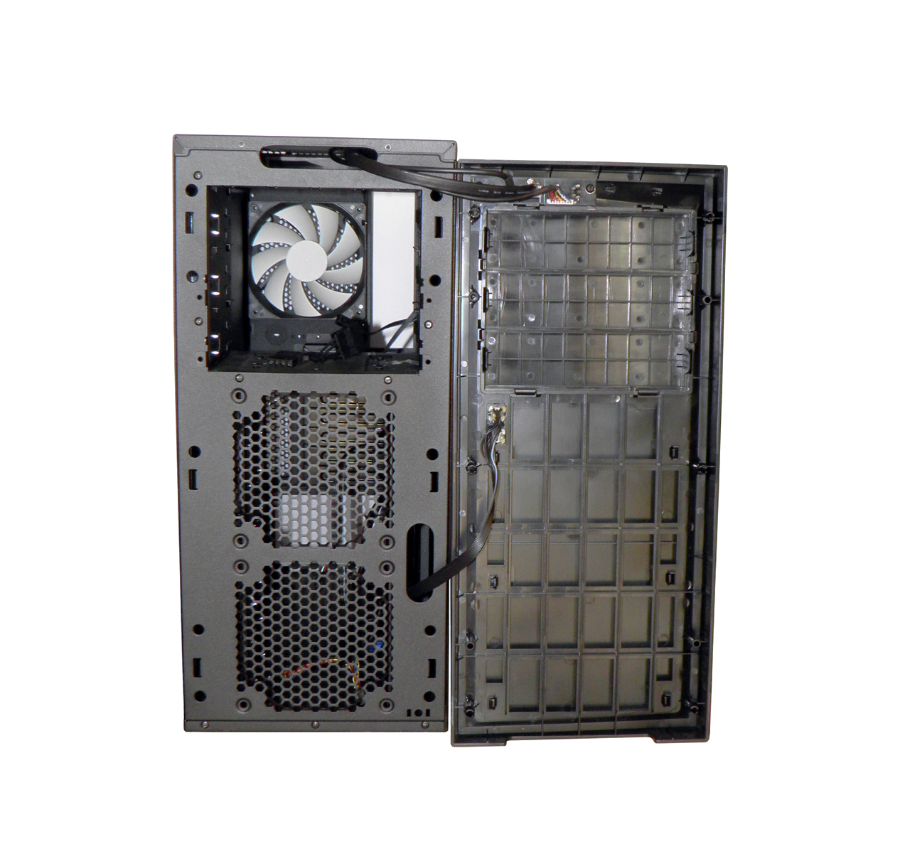 Le ventole sono installabili dall'esterno, il pannello frontale si smonta senza particolari difficoltà (occorrono solo un paio di pinze). Come già segnalato, si nota purtroppo l'assenza di filtri antipolvere anche in questa parte del case.