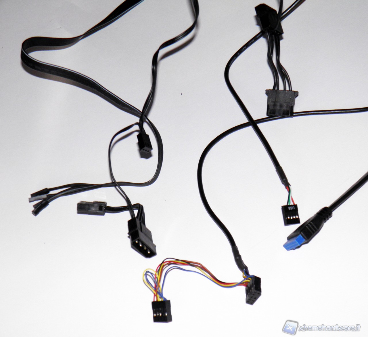Presenti i vari cavi di connessione all'hardware: USB 3.0, USB 2.0, connettore audio, 2 connettori ventole (con adattatore per collegarle direttamente all'alimentatore) e i connettori per i pulsanti del case.