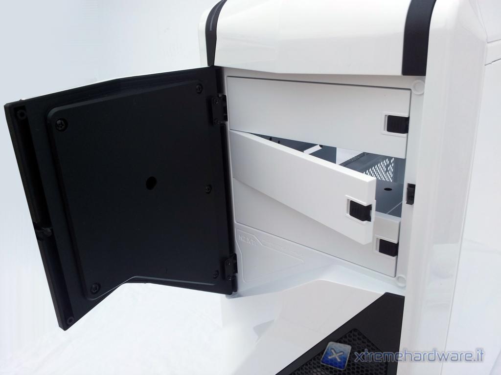 Lo sportellino che racchiude gli slot da 5,25”riprende le lineedel case ed è apribile semplicemente spingendo la parte destra. In questo modo si avrà accesso a tre slot da 5,25”, un numero inferiore rispetto al Phantomtower dovuto principalmente alle dimensioni contenute della nuova versione.