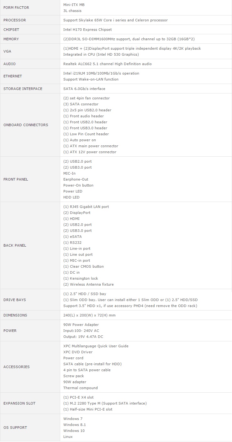 A seguire invece le Specifiche Tecniche del modello XPC Slim XH170V: