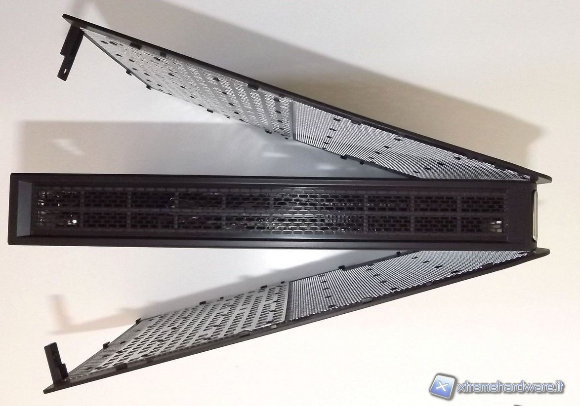 I due pannelli laterali sono costruiti da una parte con PVC ad alta resistenza nero. Questa è la parte che è direzionata verso l'ambiente esterno, mentre nella parte interna troviamo una prima griglia di alluminio lungo tutto la paratia laterale con una trama del disegno più fitta ed un'ulteriore griglia posta in corrispondeza della zona dissipatori passivi del processore e della scheda video. Questa seconda griglia ha uno spessore superiore rispetto alla prima ed un disegno diverso.
