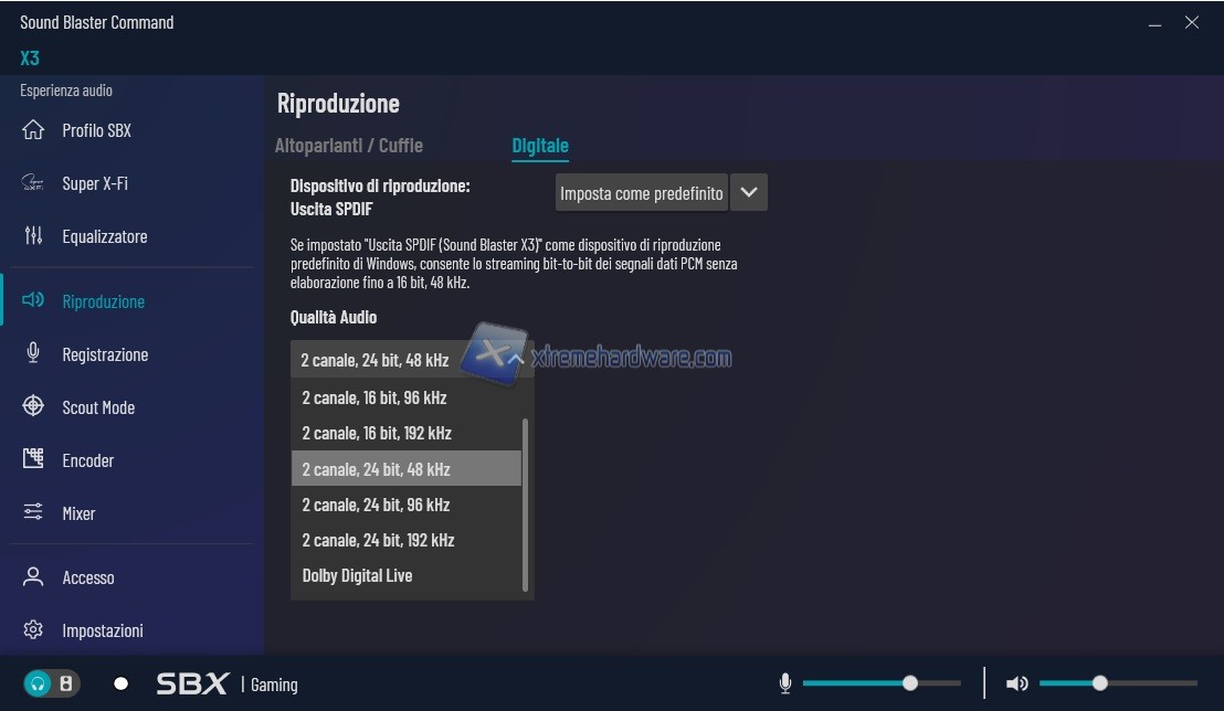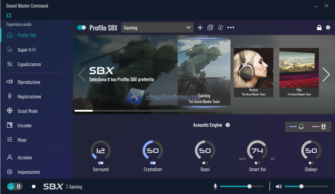 Si parte da ‘’Profilo SBX’’ dove troviamo una lista di diversi profili precaricati. Profili che potranno essere scelti dal Menu a tendina a tramite scorrimento laterale con le frecce. Oltre i classici di default sono presenti anche diversi giochi tra i più famosi. Ogni profilo mette a disposizione poco più sotto alcune voci che sono ‘’Surround’’, ‘’Crystalizer’’, ‘’Bassi’’, ‘’Smart Vol’’ e infine ‘’Dialog+’’ che potranno essere eventualmente personalizzati nel caso il Preset di base per quel Profilo non sia di vostro gradimento. Avrete inoltre massima libertà di personalizzazione con cui editare suddetti profili. Creazione, cancellazione, salvataggio.