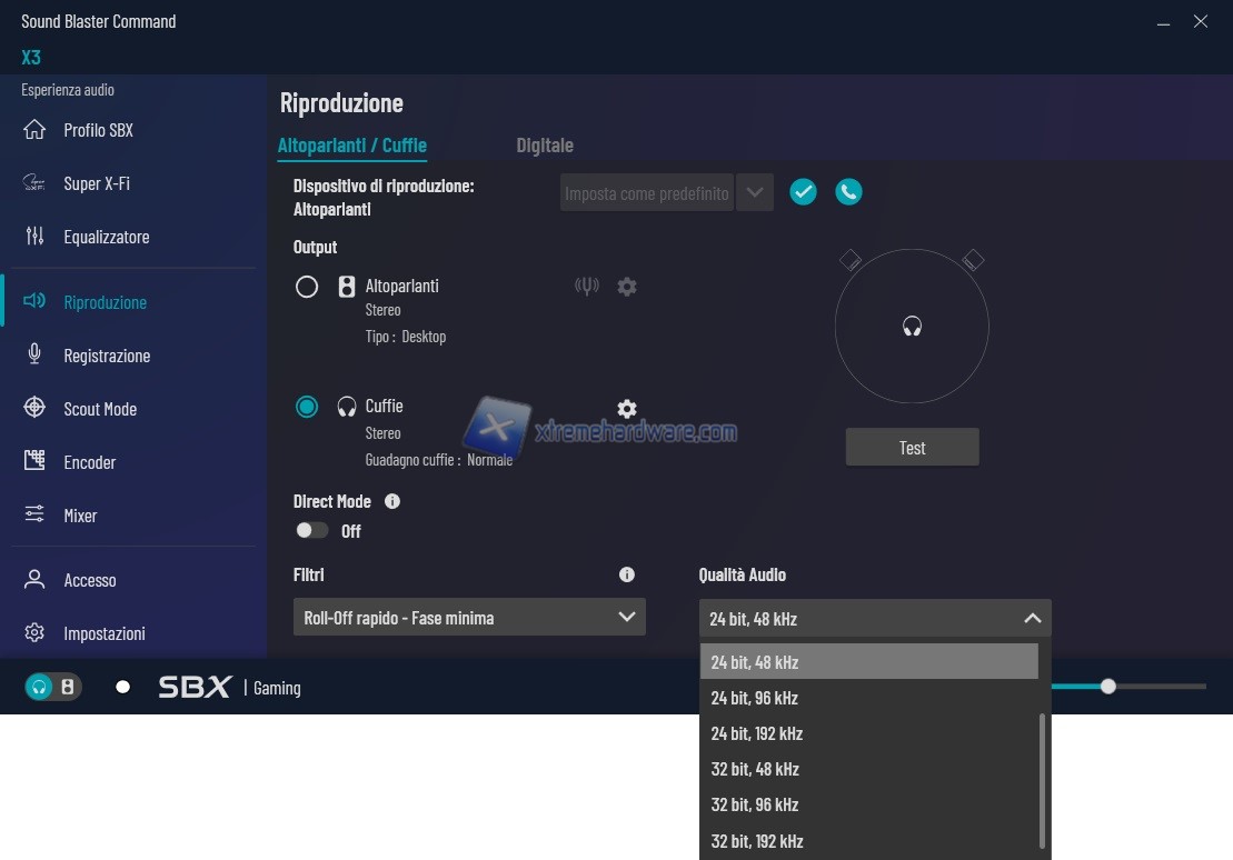 Proseguendo tra i Menu principali si passa a ‘’Super X-FI’’. Il Menu permette di agire e di avere, previa registrazione e download su smartphone dell’App, una mappatura del vostro orecchio e successiva creazione anche in base alla tipologia di cuffia che state utilizzando (sono presenti come predefinite solo le principali o le più conosciute/commercializzate) di un profilo che darà il meglio dalla tecnologia Super X-FI. Ciò permetterà a Creative due cose. La prima la creazione di un database in costante aggiornamento e la seconda lo sviluppo della suddetta tecnologia con quante più informazioni possibili fornite direttamente dagli utenti finali.