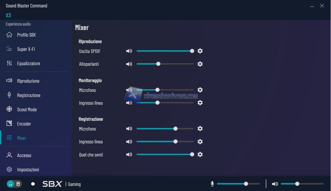 Menu ‘’Mixer’’ che come suggerisce il nome permette di regolare l’audio di ogni singola uscita/entrata della scheda Sound Blaster X3.