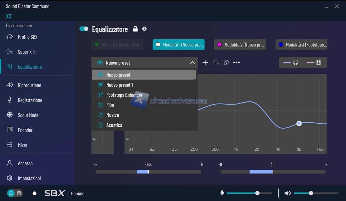 Menu ‘’Equalizzatore’’ come suggerisce già il nome ci permette di avere dei Profili precaricati o di personalizzarli secondo le nostre esigenze. Potremo impostare i principali come funzione di scelta rapida. In questo modo ci basterà cliccare il tasto fisico sulla scheda per richiarmarlo al volo. Non dovremo più ALT-Tabbare o fare giri particolari. Tutto sarà a portata di dito.