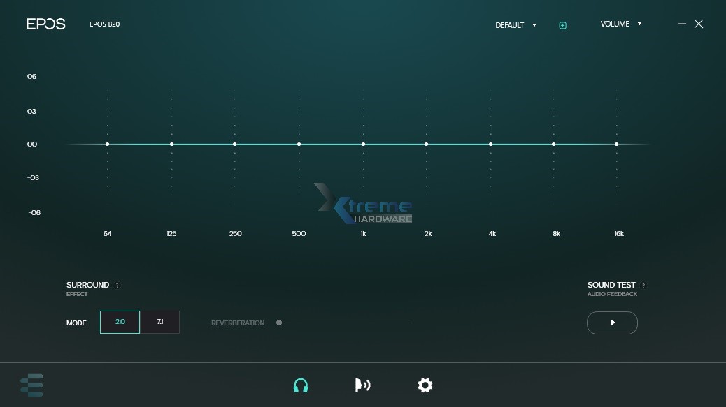 Il software si struttura su tre menu che sono presenti nella parte inferiore e vengono raffigurati dalle tre relative icone. La prima, quella di riproduzione, mette a disposizione un grafico con il quale potremo creare un nuovo preset audio se quei pochi di default non dovessero essere soddisfacenti. Come anticipato notiamo la presenza della modalità Stereo 2.0 o di quella Surround 7.1.