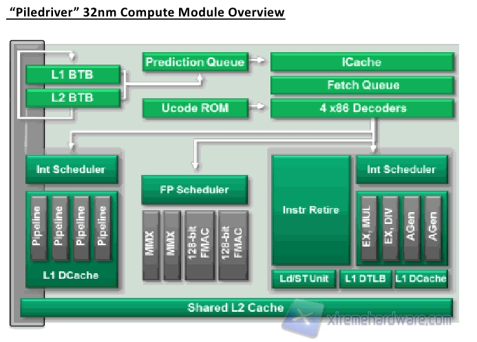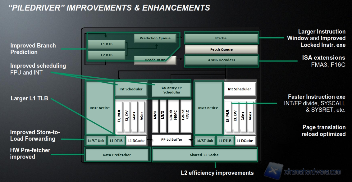 La nuova CPU è costruita con un processo produttivo di 32nm HKMG (High-K Metal Gate) ed è dotata di un numero massimo di 4 core (in moduli da 2) dotati di 128 KB di cache L1 e fino ad un massimo di 4MB di cache L2, nel caso avessimo un quad core (2 x 2MB L2) e di 2 Unita di Calcolo in Virgola Mobile (FPU) da 128-bit l’una.