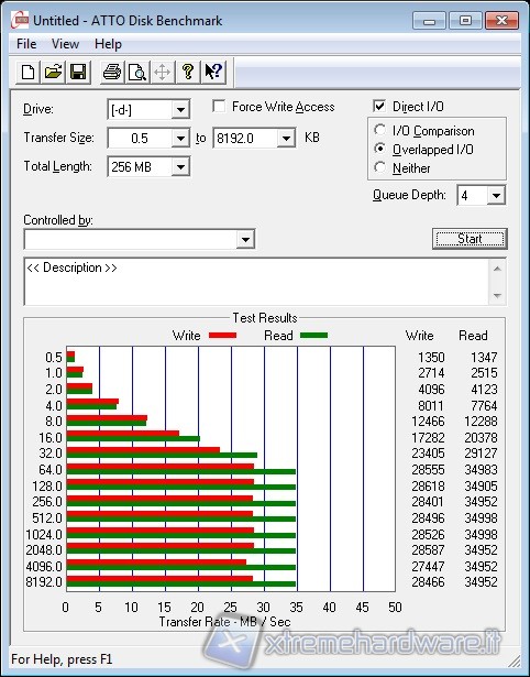 Esaminiamo di seguitola bandwidth della Sabertooth X79 dal lato dellaconnettività USB. Verranno utilizzati ATTO ed CristalDiskMark per misurare i valori di Transfer-Rate connettendo il pen drive USB 3.0 Kingston DT-Ultimate 64GB sia ad una porta USB 3.0 sia alla più lenta USB 2.0. I risultati ottenuti sulla porta USB 2.0 sono riportati di seguito: