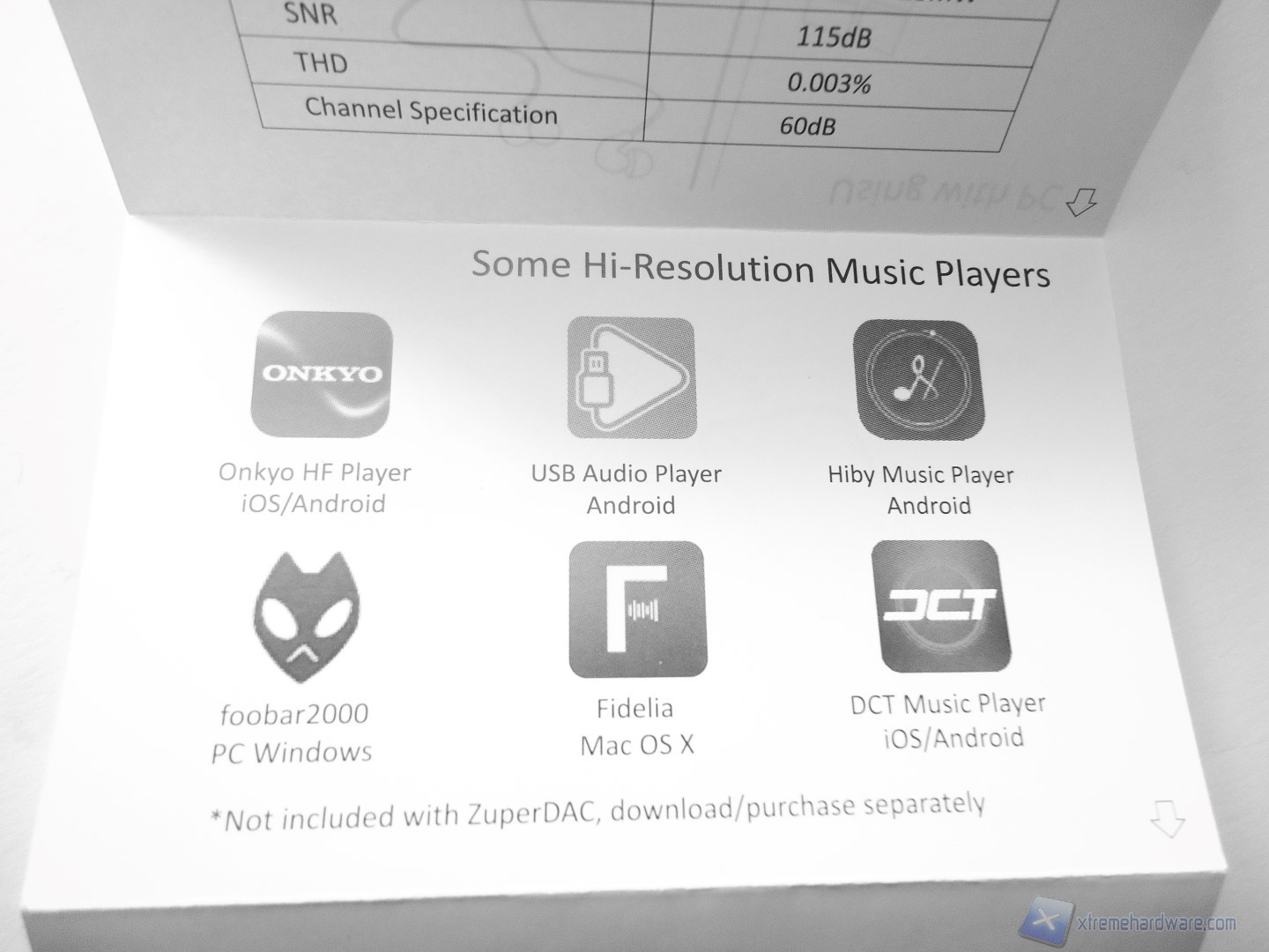 Aprendo la confezione ci troviamo davanti un piccolo manualetto che ci illustra le varie specifiche del prodotto oltre che consigliarci alcuni player audio per la nostra musica in alta risoluzione. Sotto questo foglietto troviamo il nostro DAC USB custodito all’interno di una protezione in spugna.