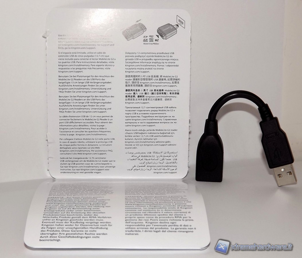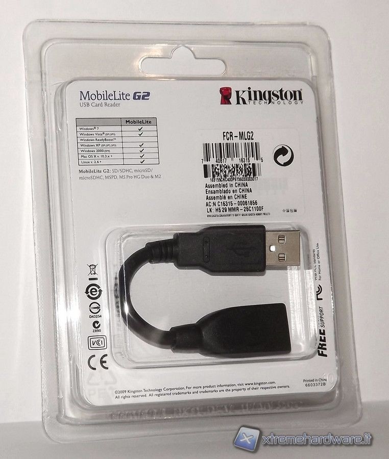 Il MobileLite G2 è inserito in una confezione di plastica strasparente che lascia intravedere il contenuto all'interno di essa. La parte anteriore della confezione mostra il logo ed il marchio di Kingston, mentre in basso è inserito il lettore di memorie in un apposito alloggio ricavato nella plastica stessa.