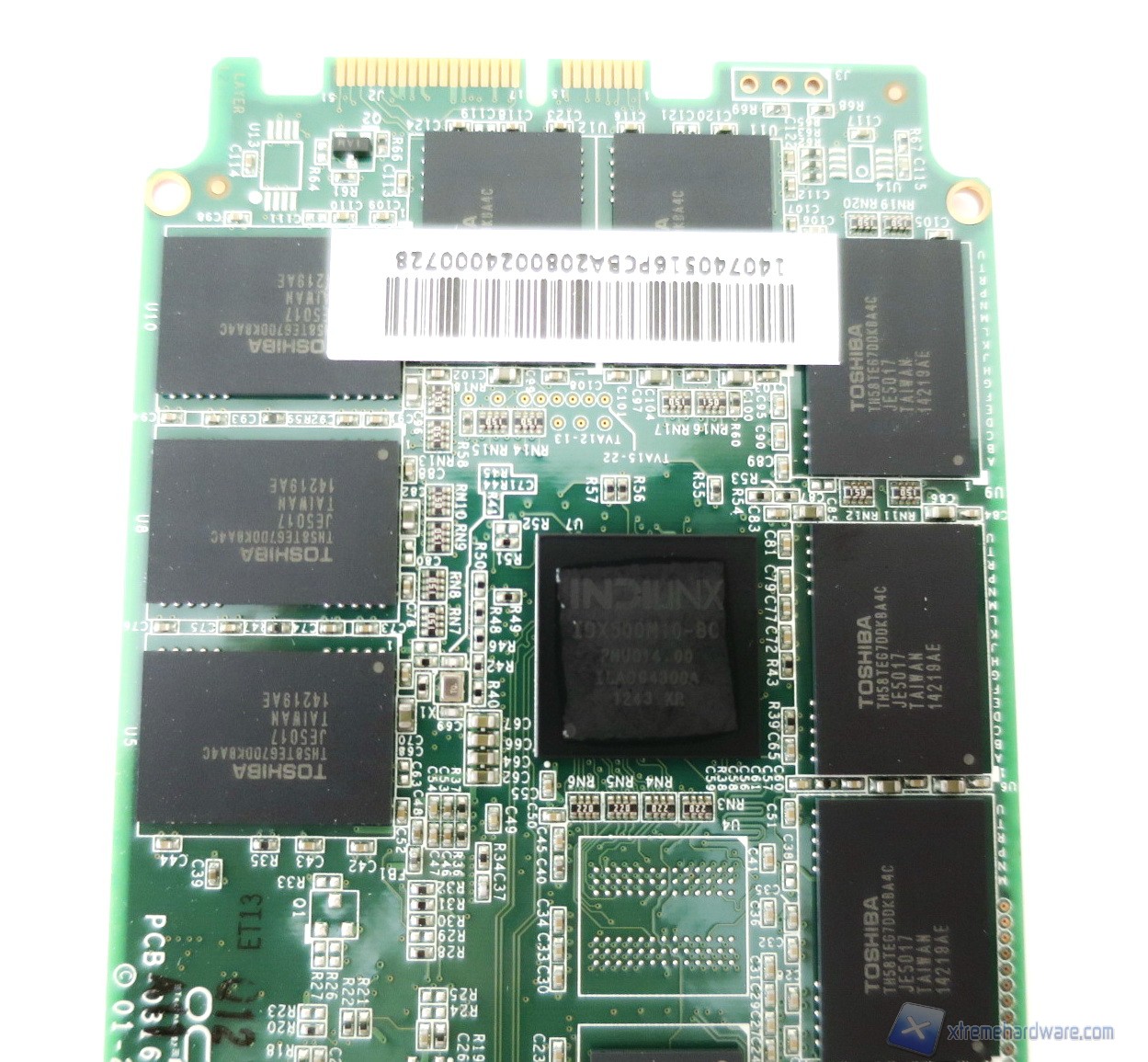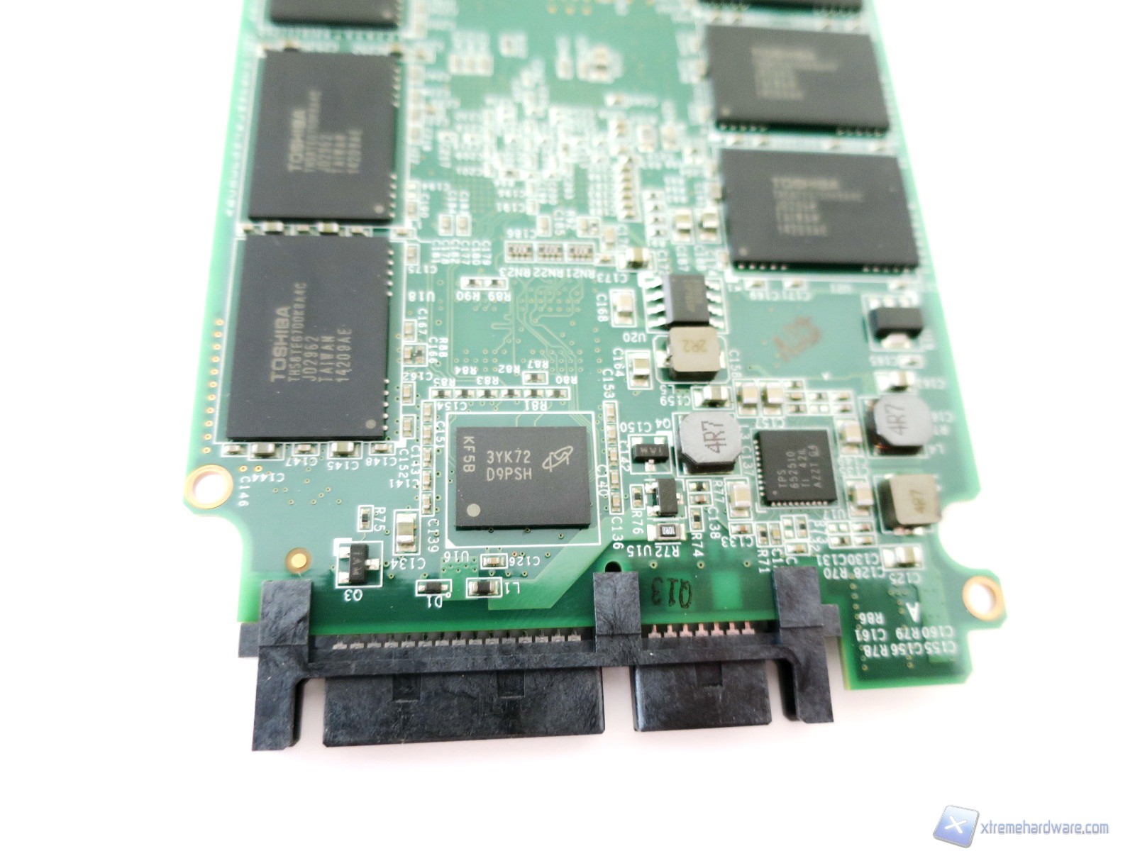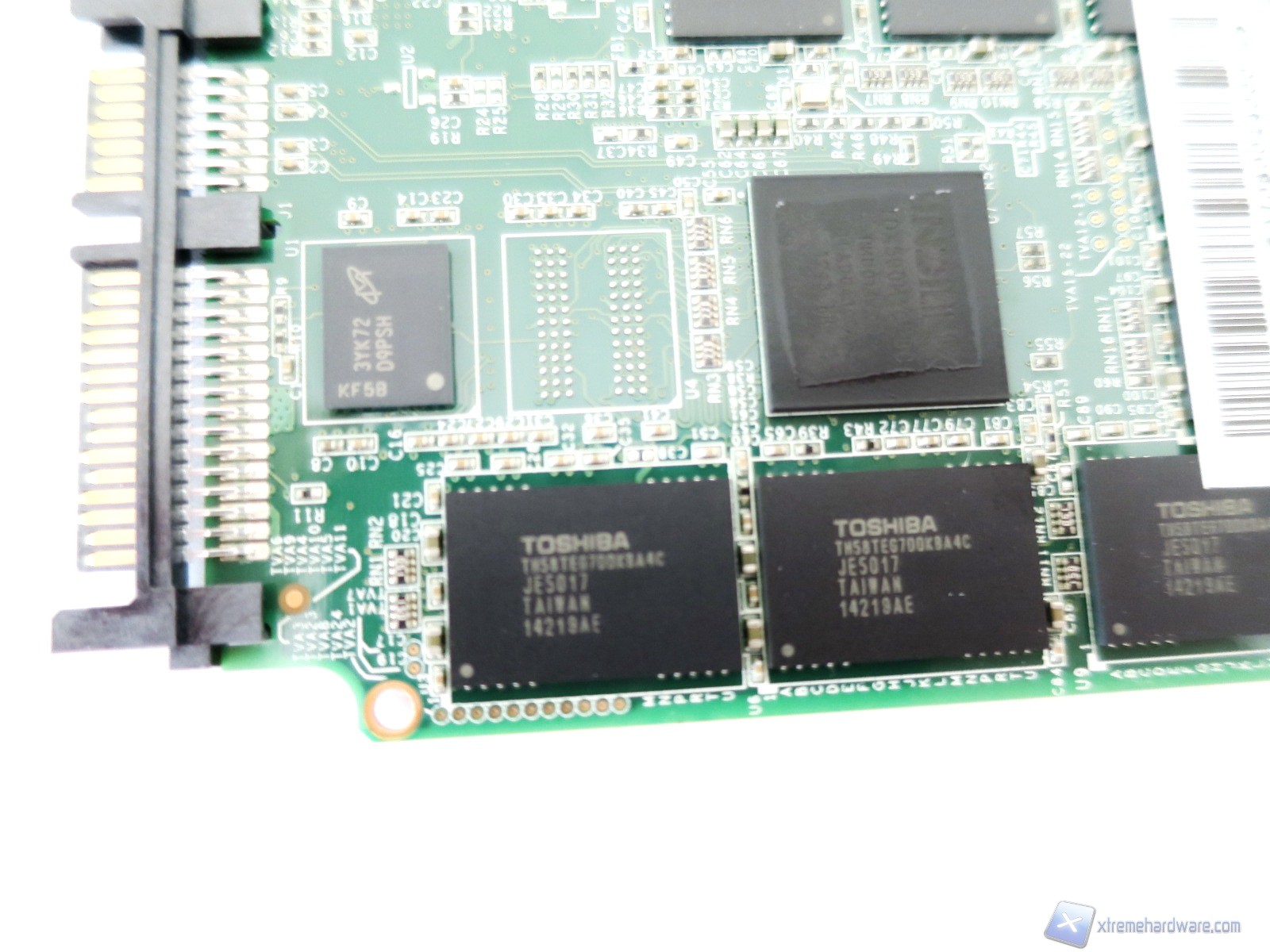 Proseguendo nell’analisi troviamo, lungo il perimetro, i chip di memoria Toshiba con sigla TH58TEG7DDJBA4C e processo litografico a 19nm. Sull’intero PCB sono ospitati ben sedici package di tipo 40 TSOP che hanno ciascuno una densità di ben 16GB (grazie a due die da 8GB). Nel dettaglio tali chip sono NAND Flash Toggle Mode sincrone con un sistema MLC (Multi Level Cell) a due bit per cella. La loro vita stimata è di circa 3.000 cicli di scrittura. Come sappiamo, inoltre, un’interfaccia di questo genere permette un maggior scambio di dati con conseguente innalzamento delle prestazioni generali del drive.