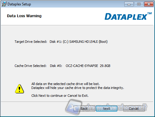 Avviato il programma, tramite installazione guidata di pochi e semplici passaggi, ci verrà chiesto di reinserire il product key, quale HDD utilizzare come target e quale SSD come cache (nel nostro caso rispettivamente il Samsung Spinpoint e l'OCZ Synapse), finita l'installazione il software renderà il Synapse un SSD di caching (previo riavvio del sistema).